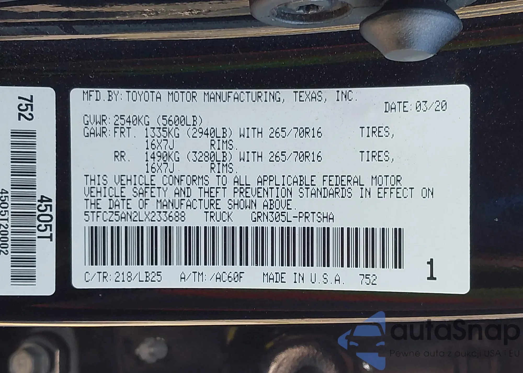 LOT: 44226262 VIN: 5TFCZ5AN2LX233688