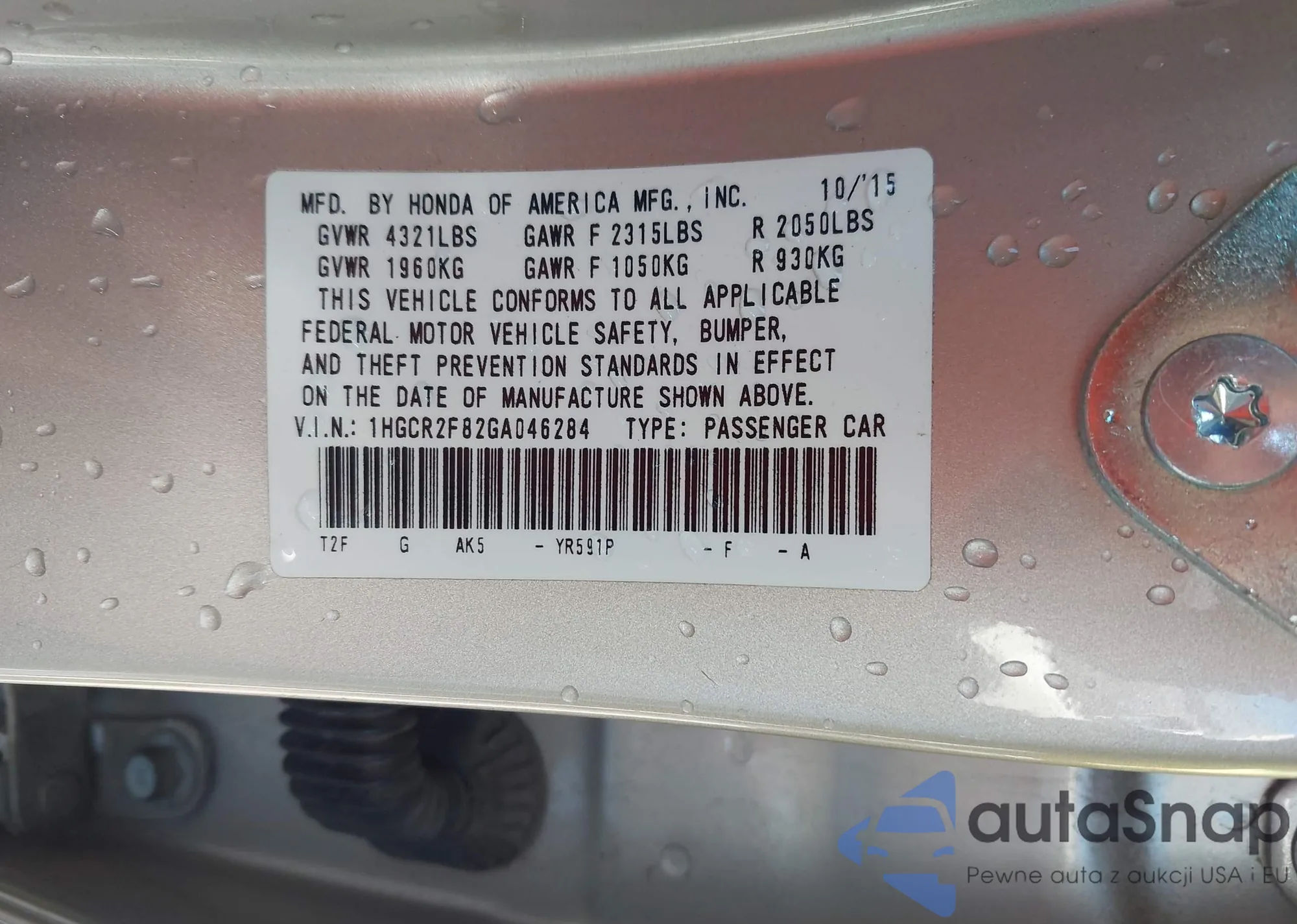 LOT: 44433207 VIN: 1HGCR2F82GA046284