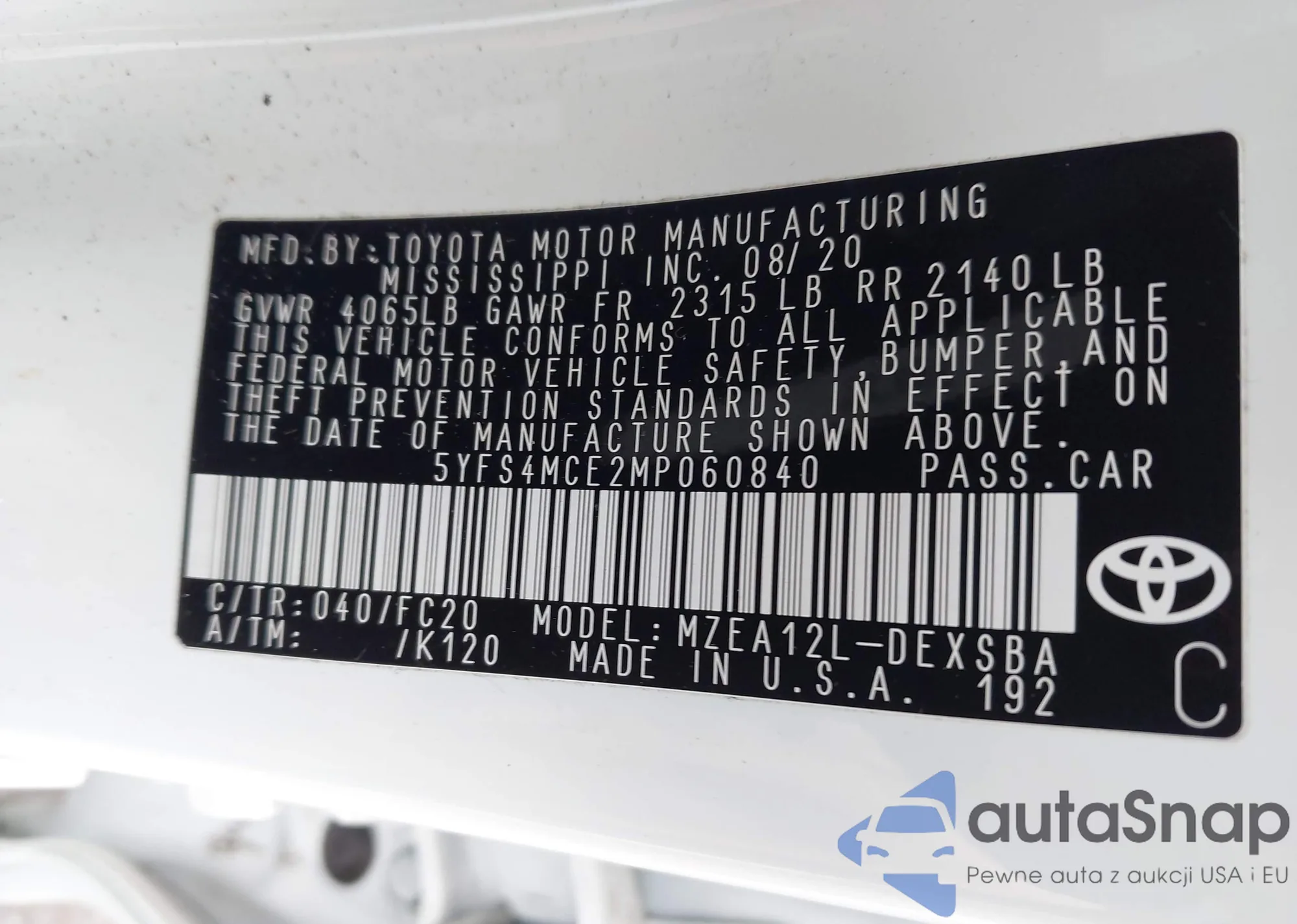 LOT: 44304096 VIN: 5YFS4MCE2MP060840