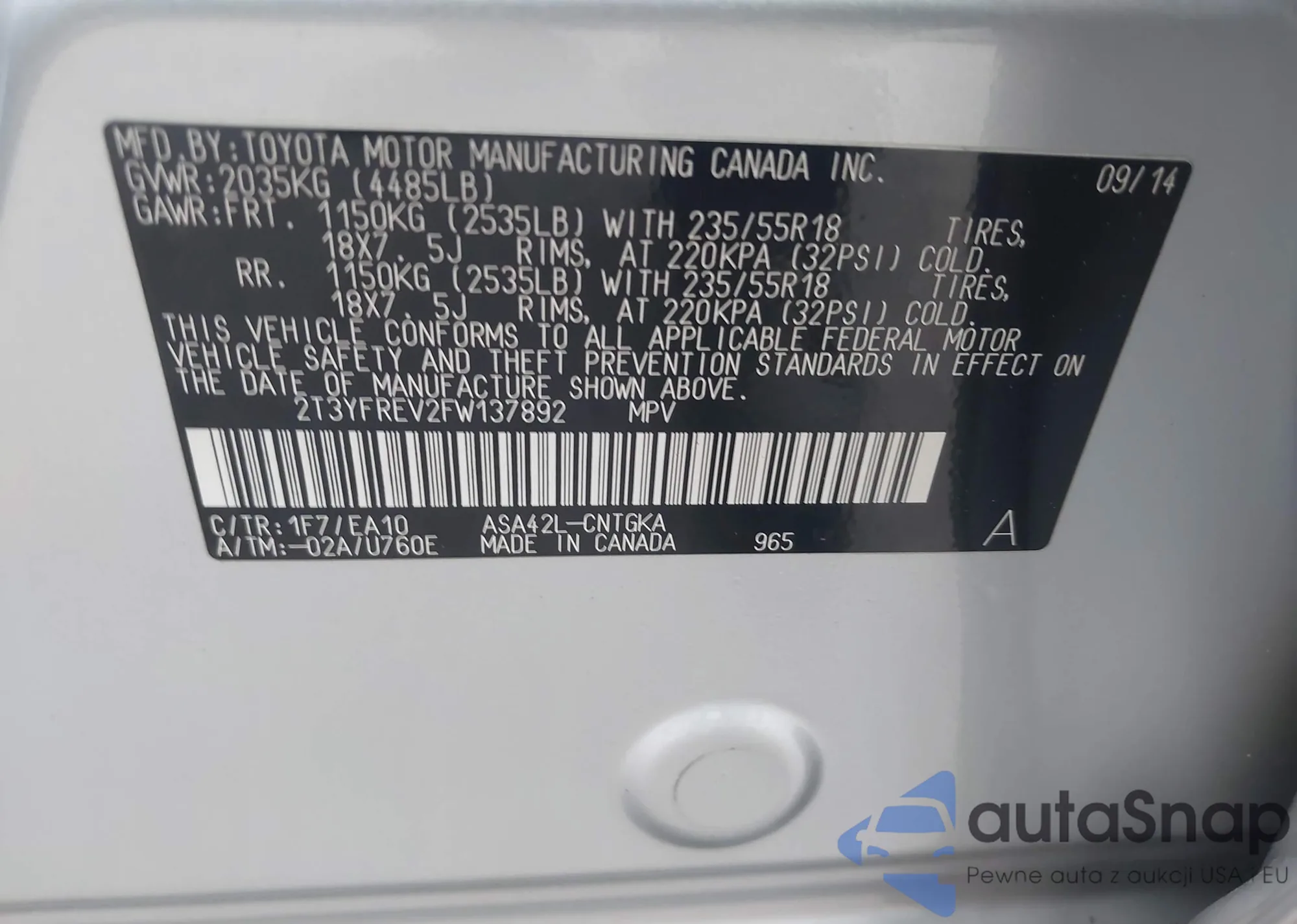 • VIN 2T3YFREV2FW137892