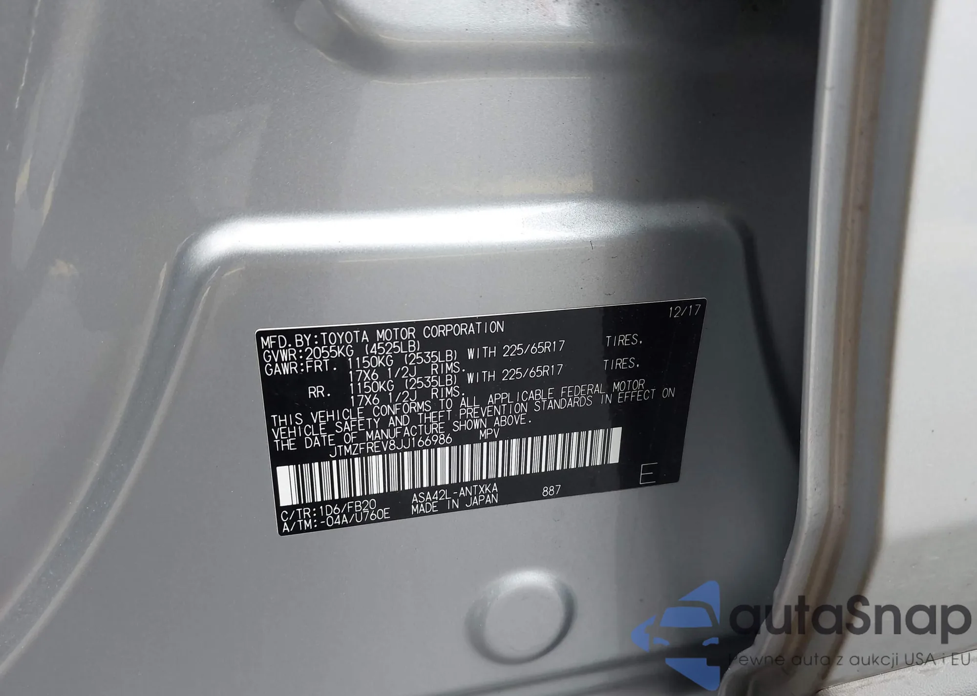 LOT: 44283253 VIN: JTMZFREV8JJ166986