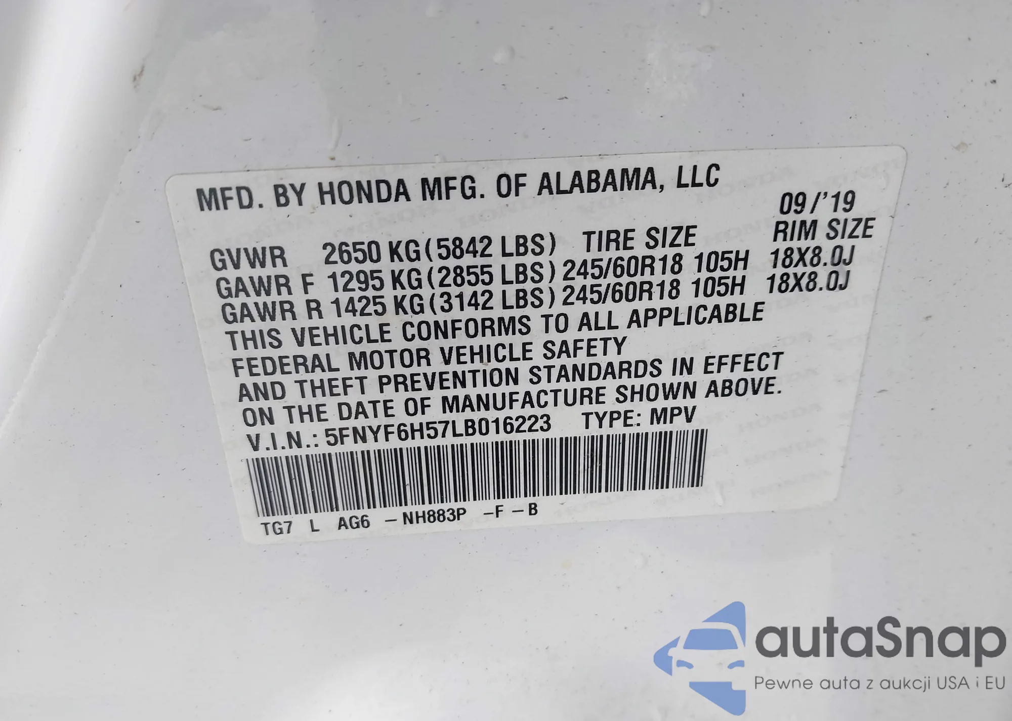 • VIN 5FNYF6H57LB016223