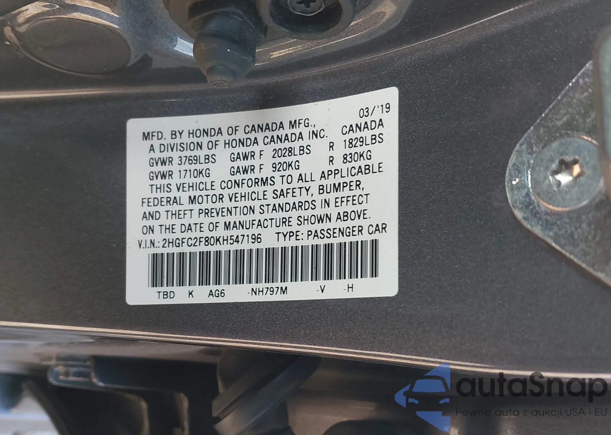 LOT: 43959667 VIN: 2HGFC2F80KH547196
