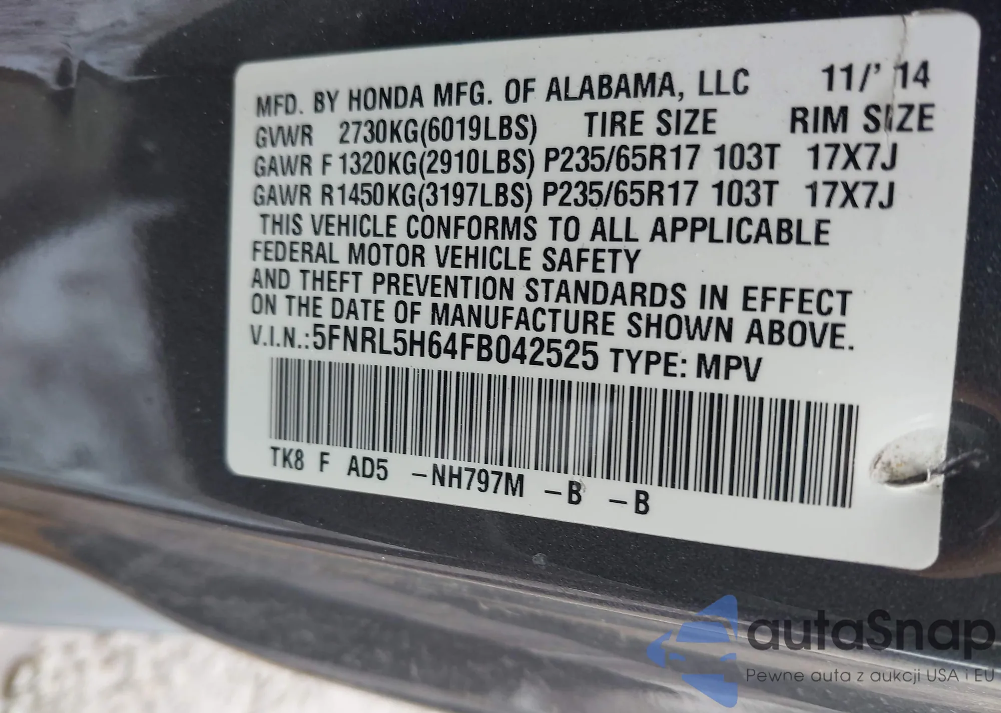• VIN 5FNRL5H64FB042525