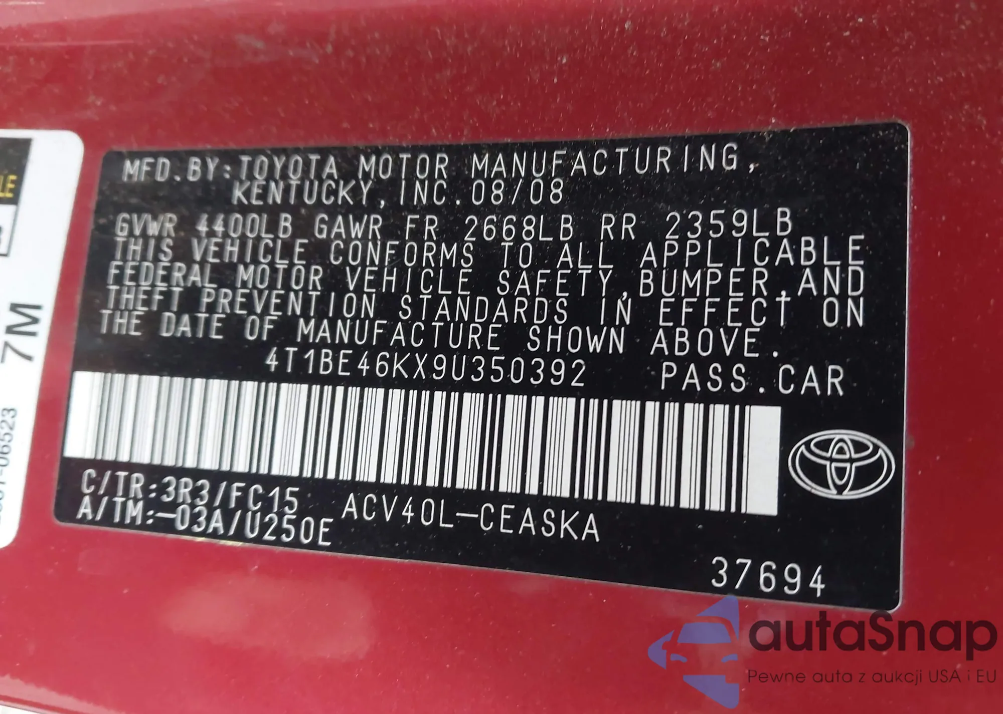 • VIN 4T1BE46KX9U350392