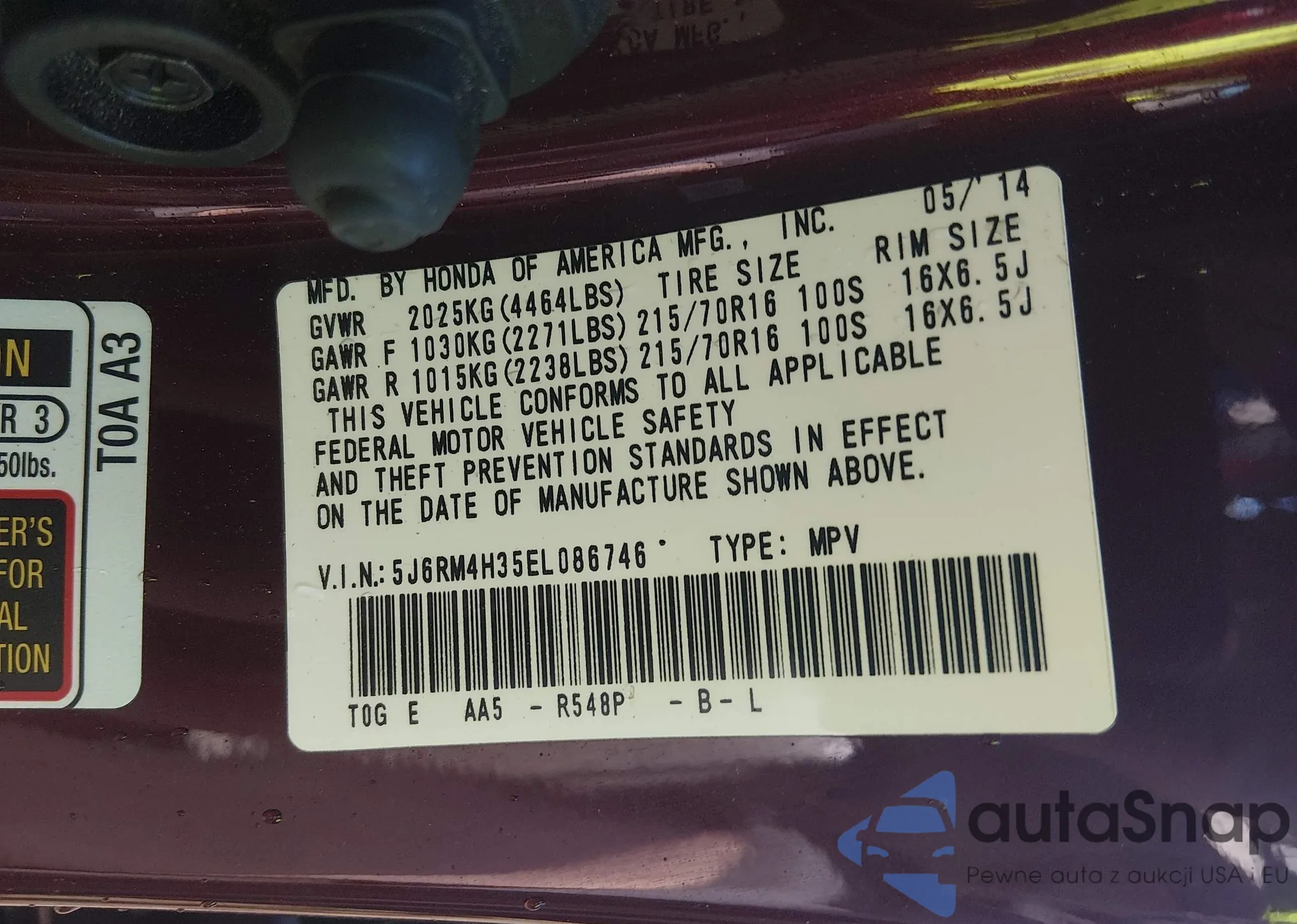 • VIN 5J6RM4H35EL086746