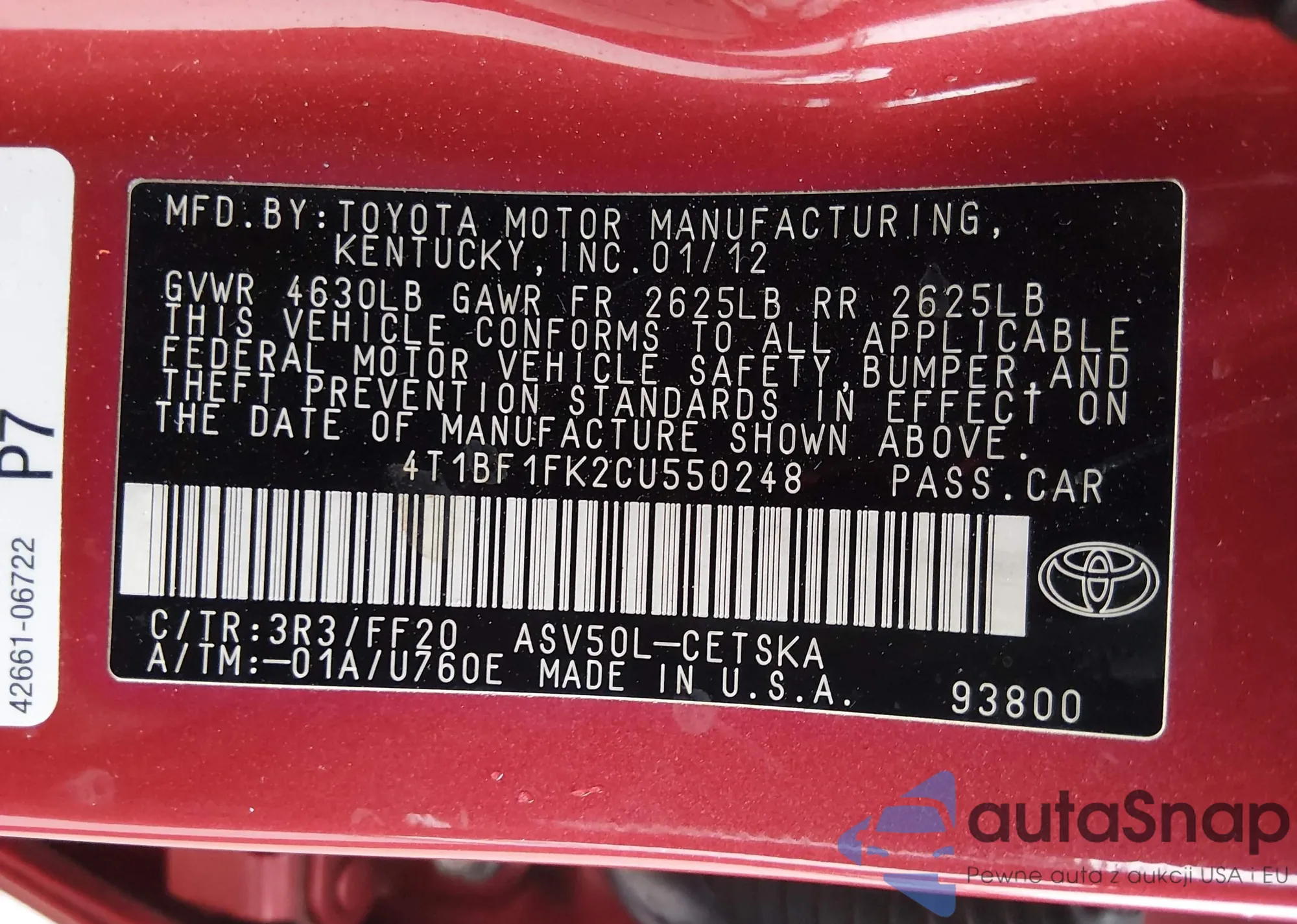 • VIN 4T1BF1FK4CU564930