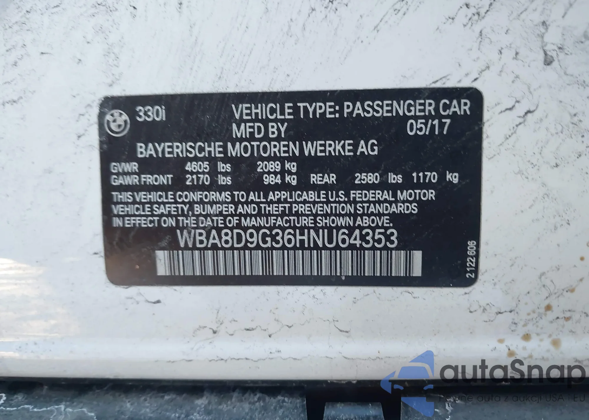 LOT: 44236268 VIN: WBA8D9G36HNU64353