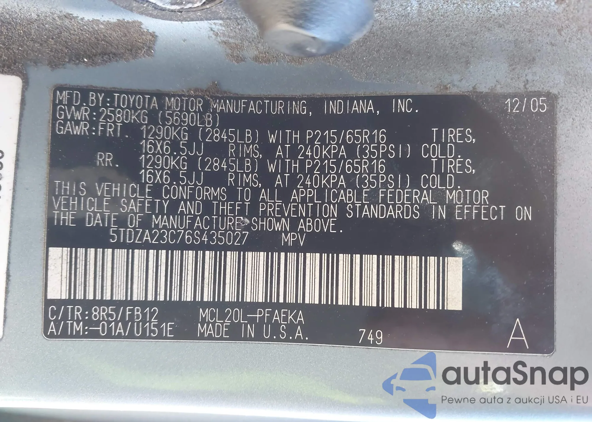 • VIN 1HGCP3F80CA018148
