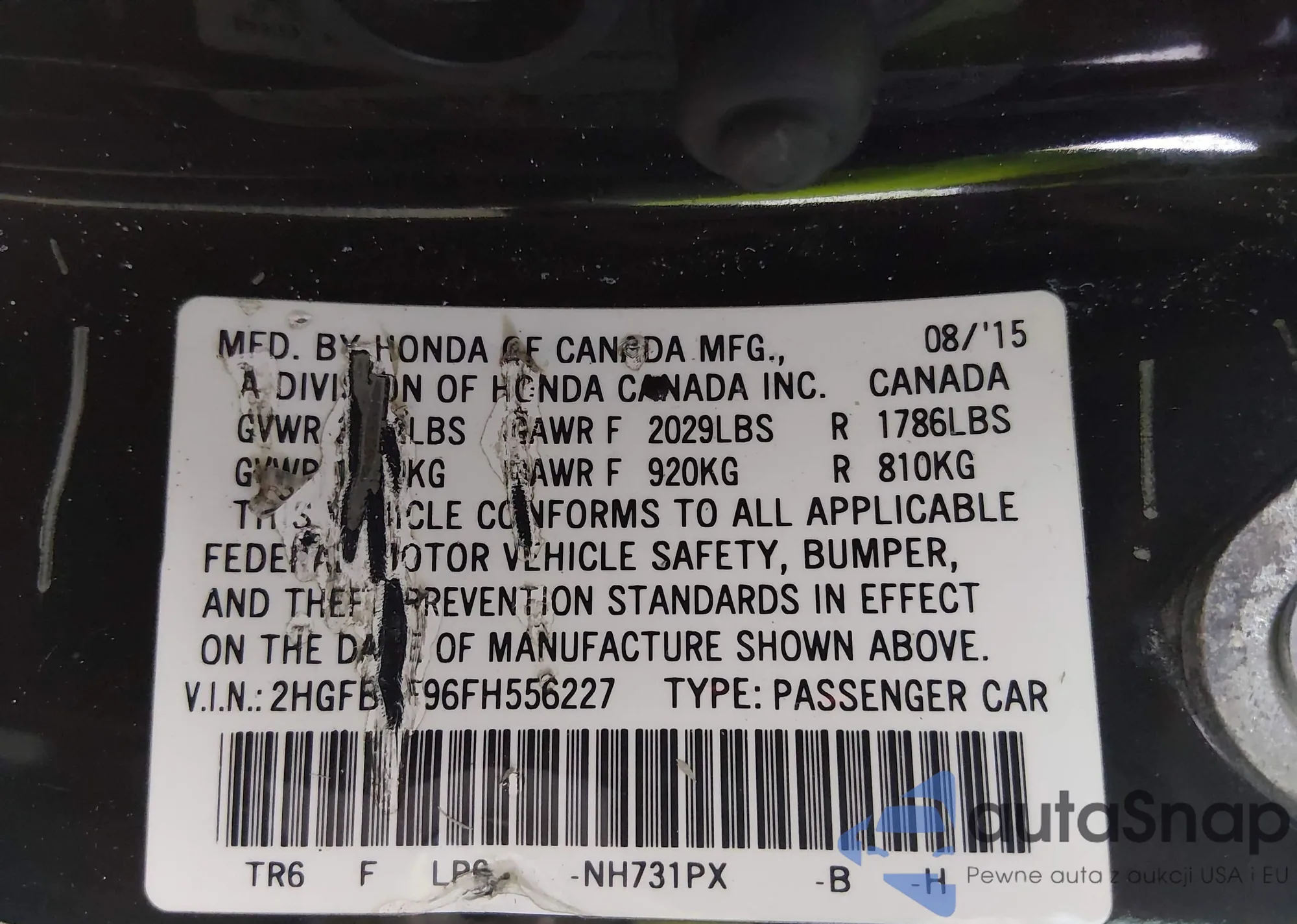 LOT: 44203336 VIN: 2HGFB2F96FH556227