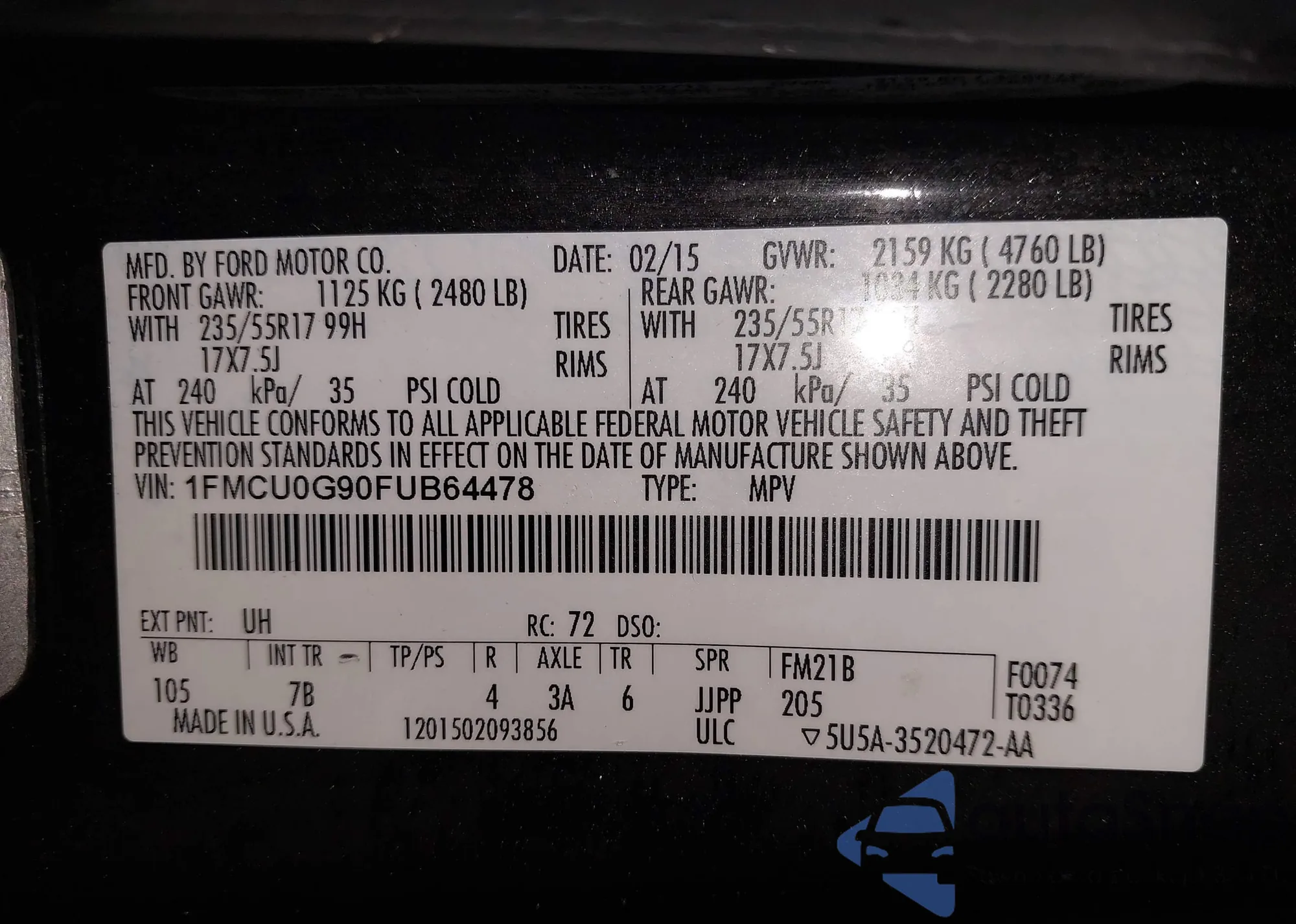 LOT: 44171237 VIN: 1FMCU0G90FUB64478