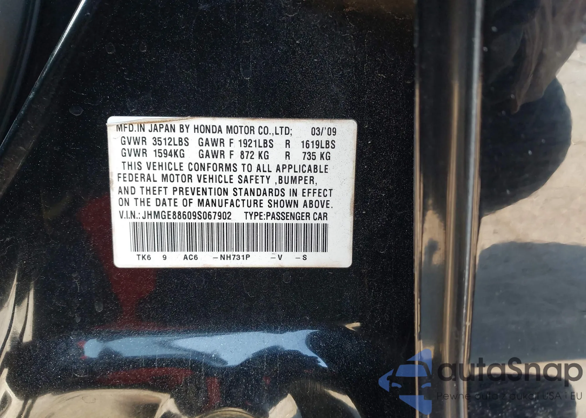 • VIN JHMGE88609S067902