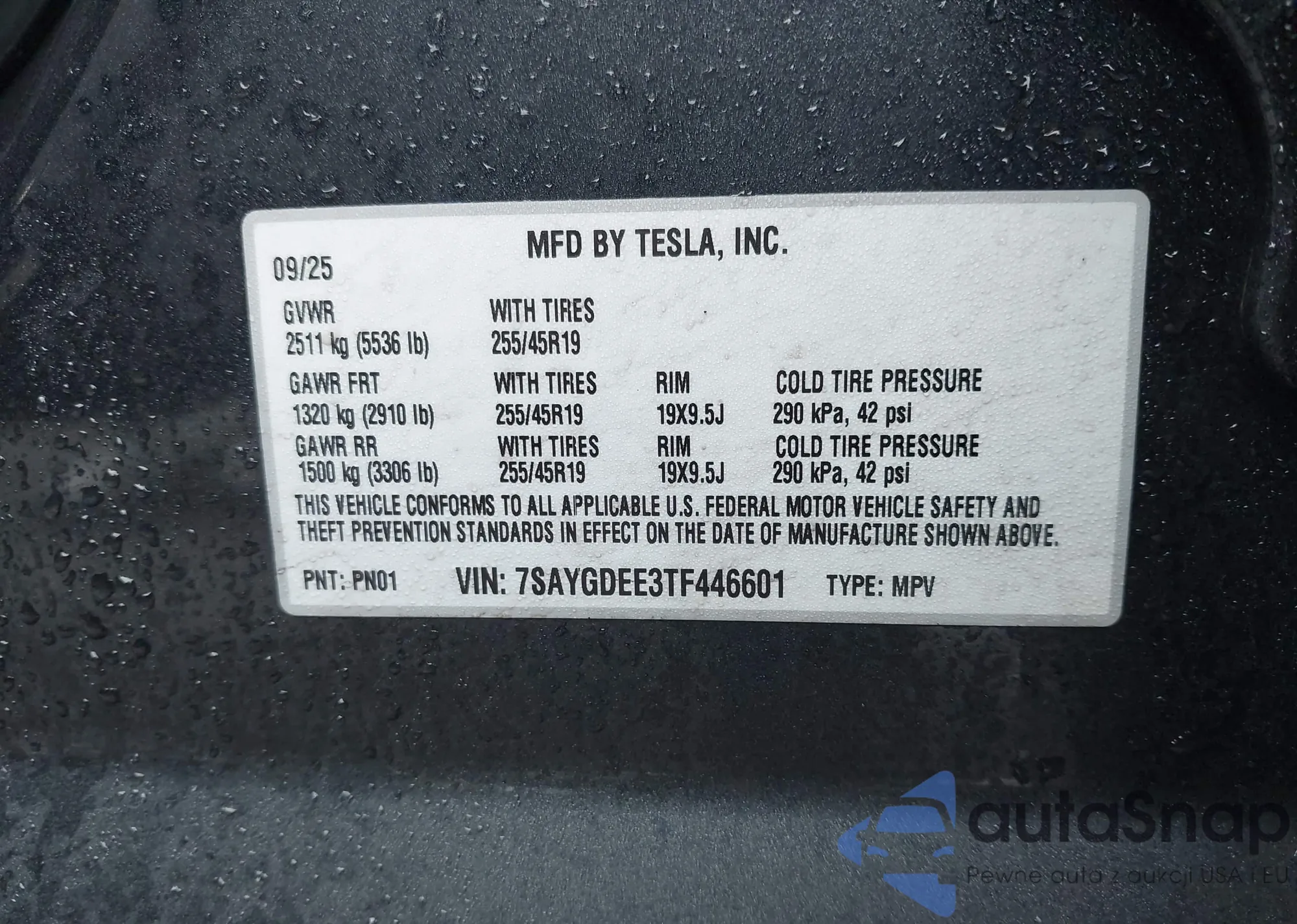 • VIN 7SAYGDEE3TF446601