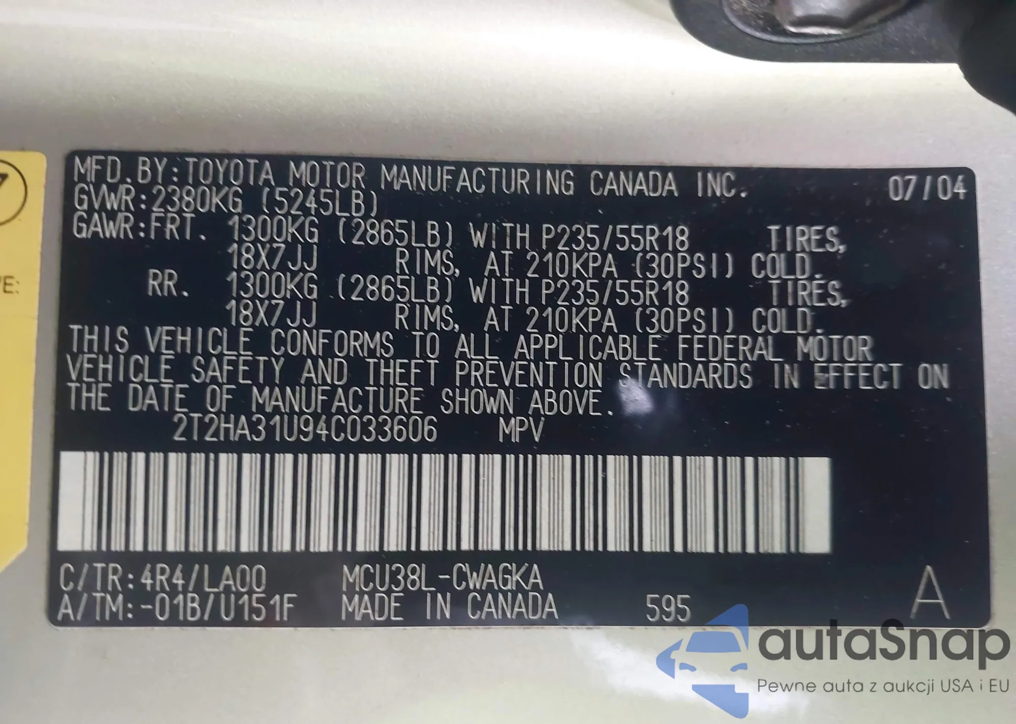 LOT: 44499290 VIN: 2T2HA31U94C033606