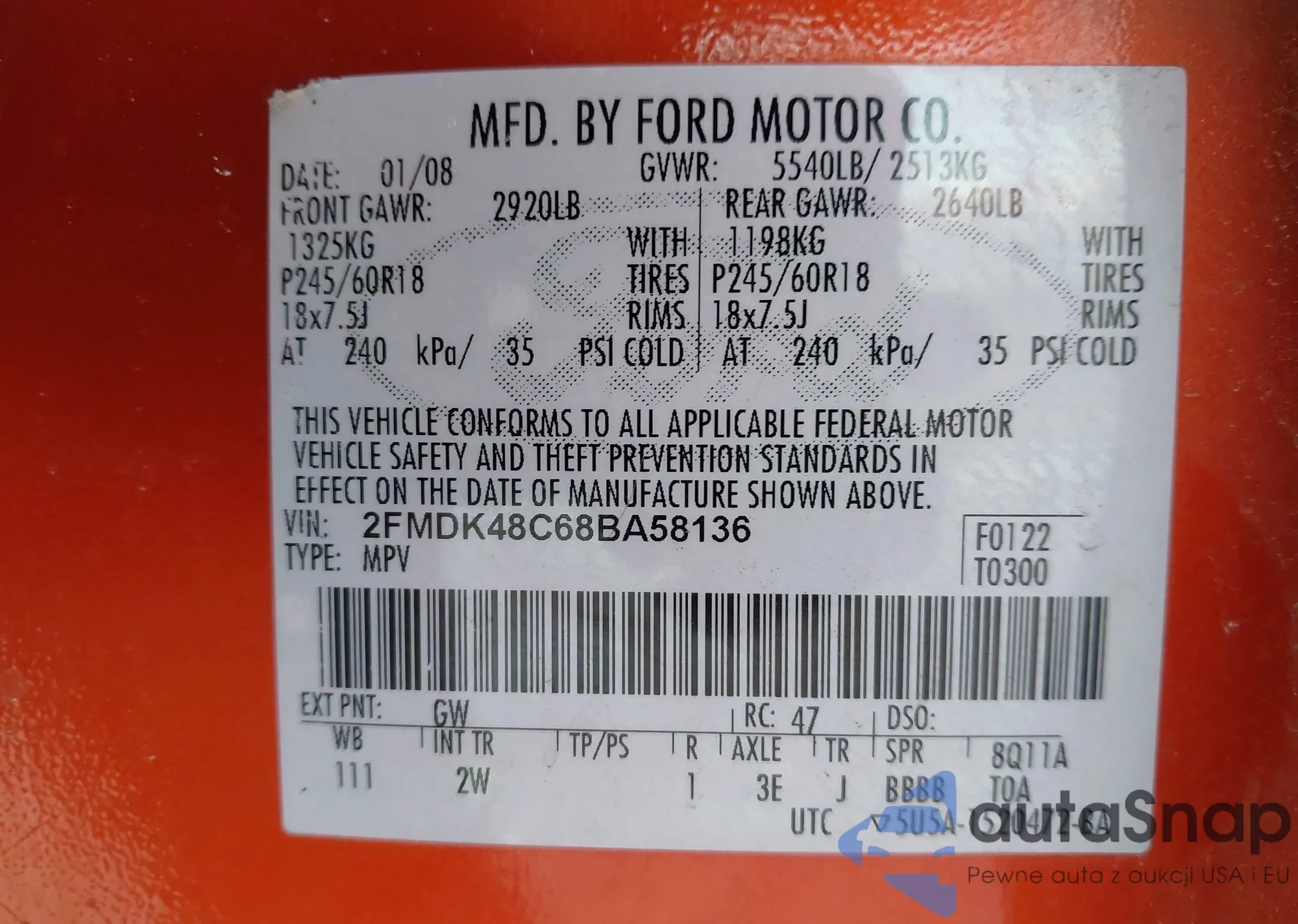 LOT: 44312125 VIN: 2FMDK48C68BA58136