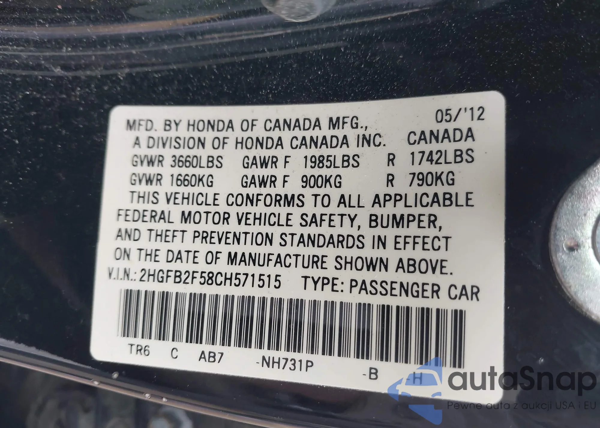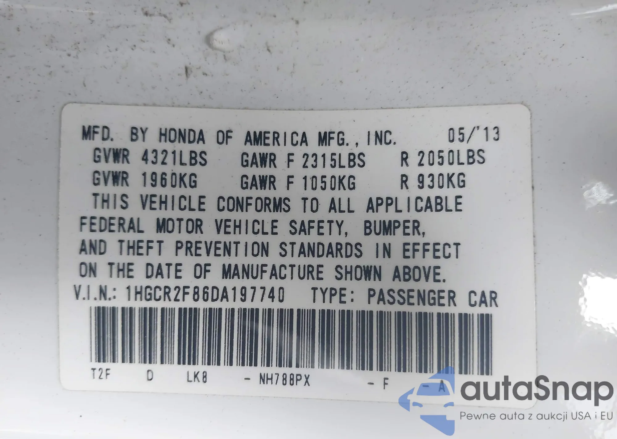 • VIN 1HGCR2F86DA197740