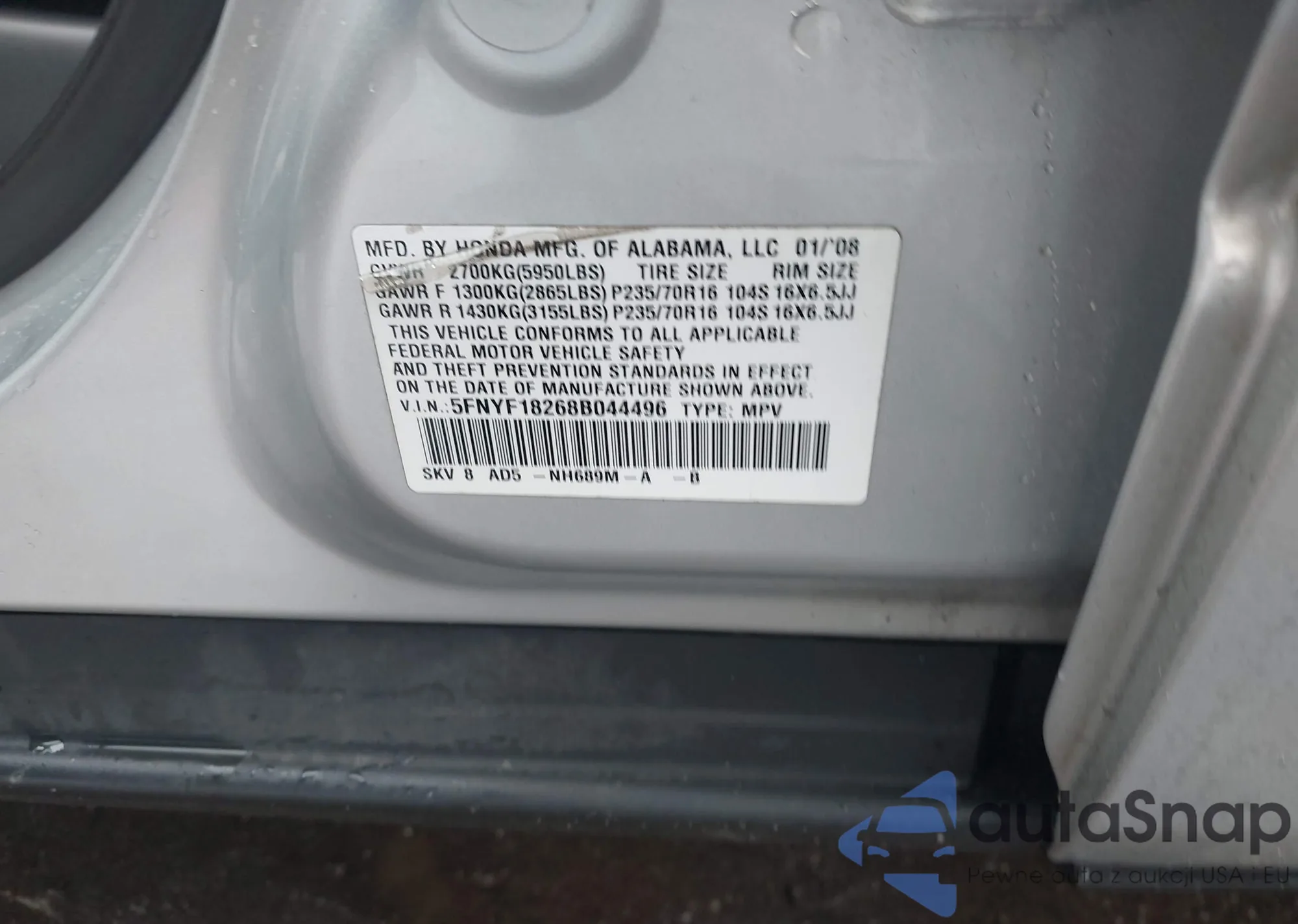 • VIN 5FNYF18268B044496
