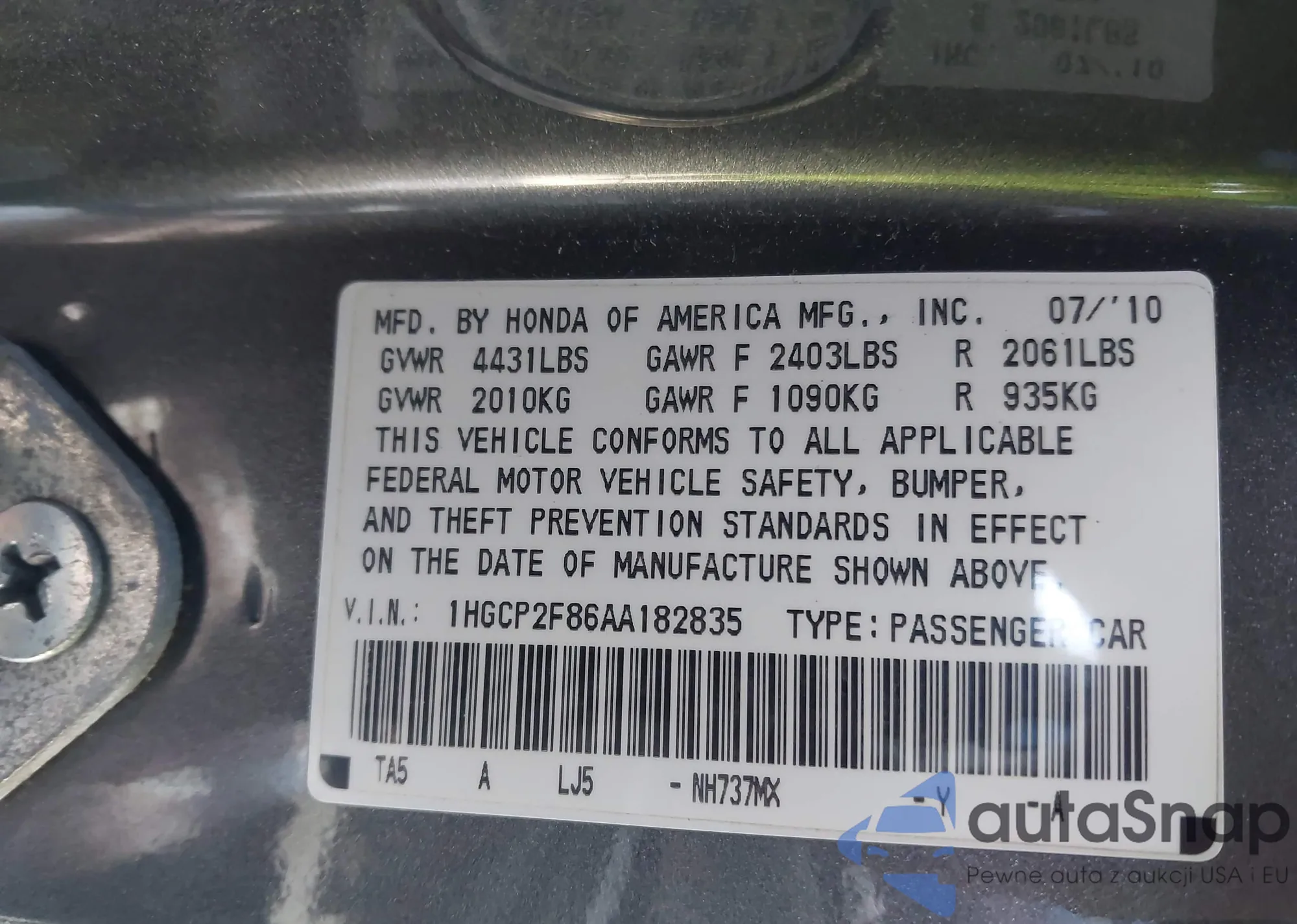 LOT: 44307106 VIN: 1HGCP2F86AA182835