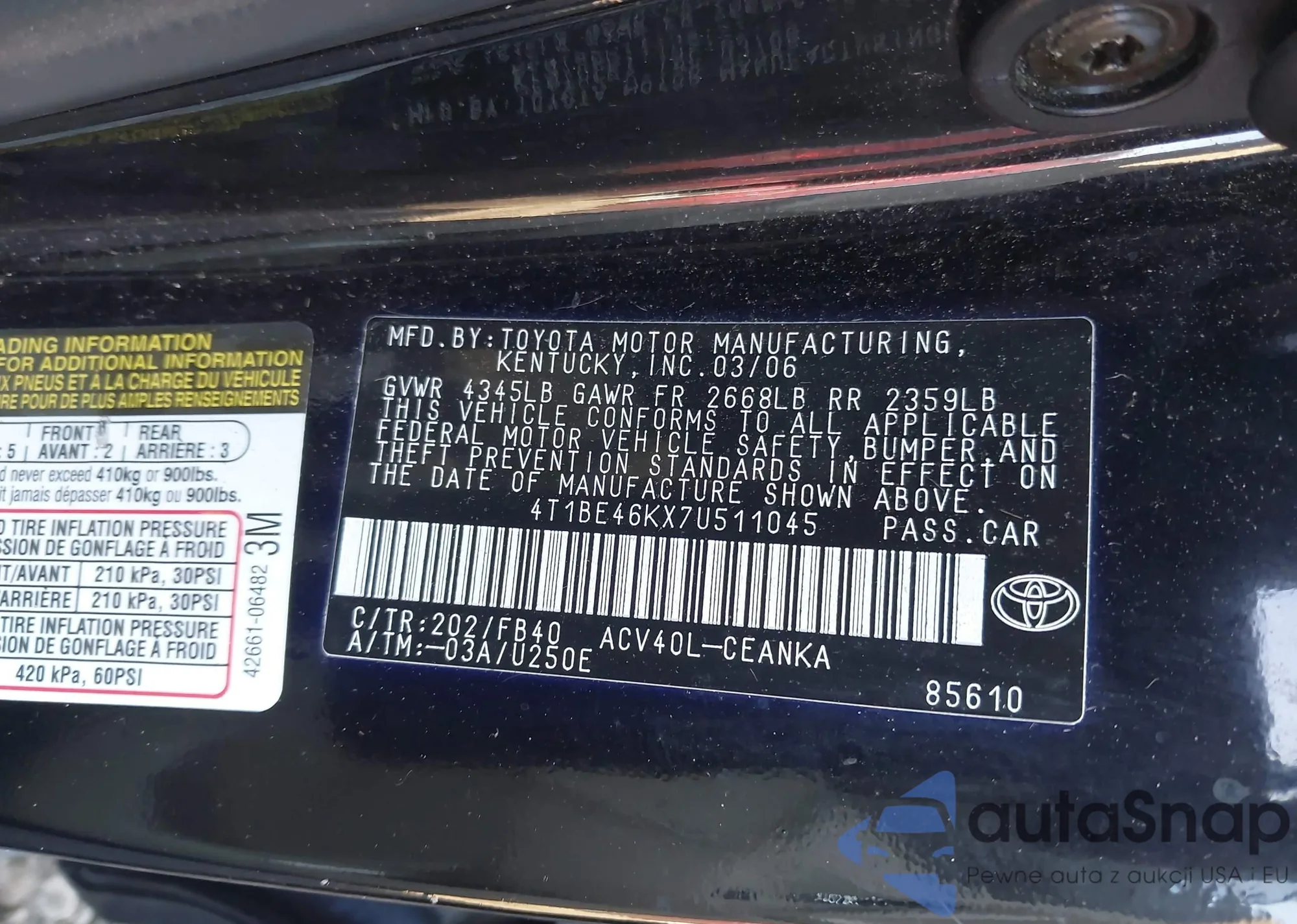 • VIN 4T1BE46KX7U511045