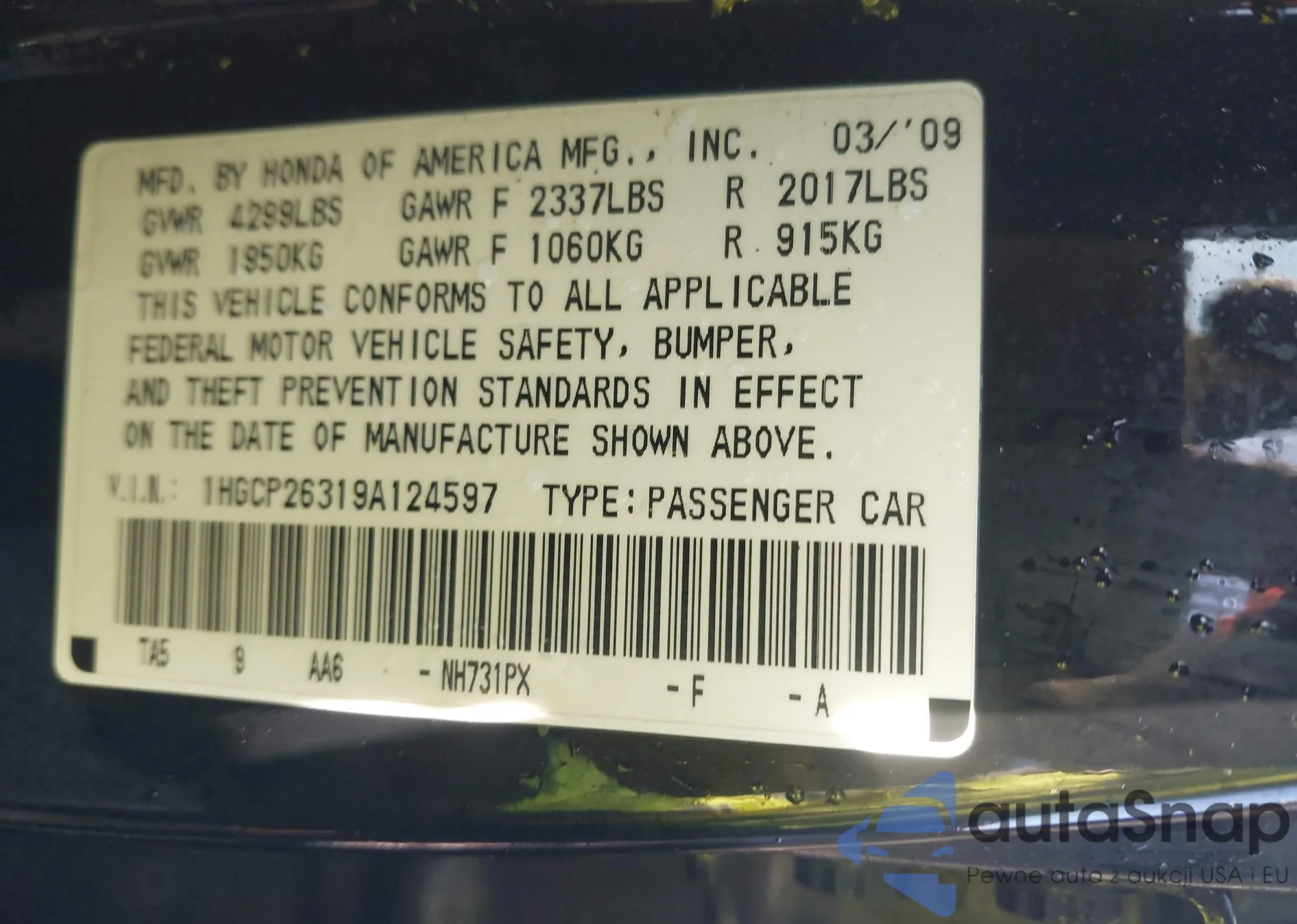 LOT: 44457113 VIN: 1HGCP26319A124597