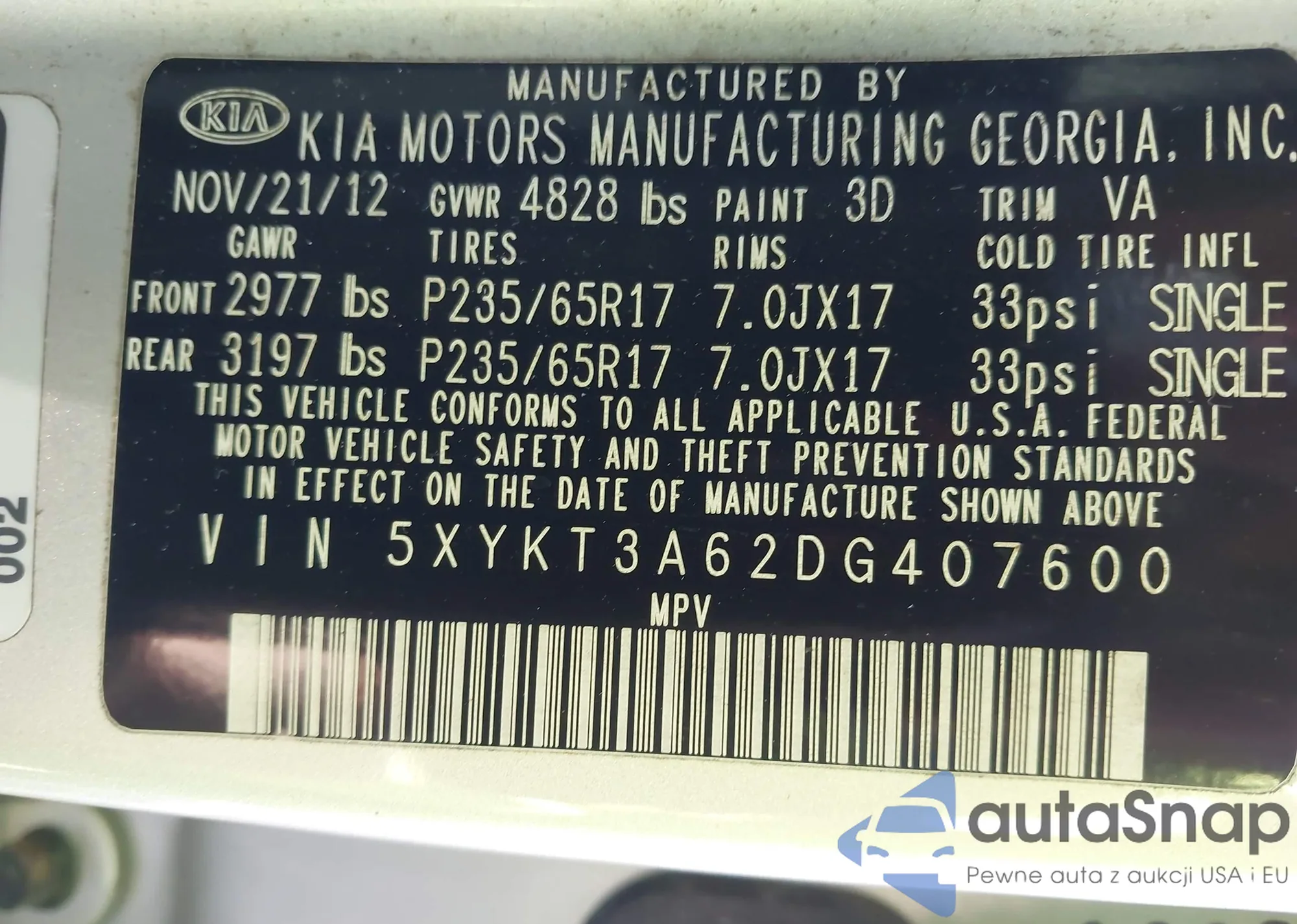 • VIN 5XYKT3A62DG407600