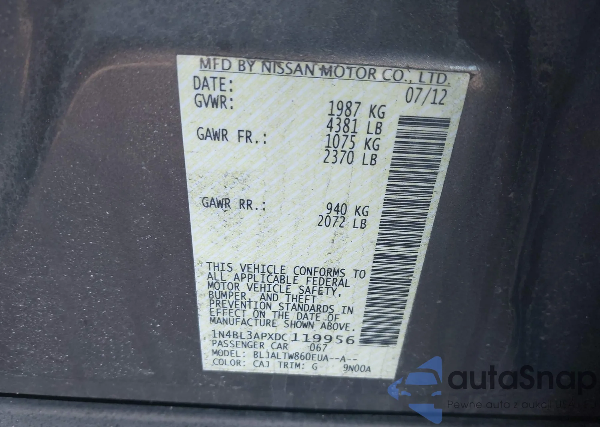 • VIN 1N4BL3APXDC119956