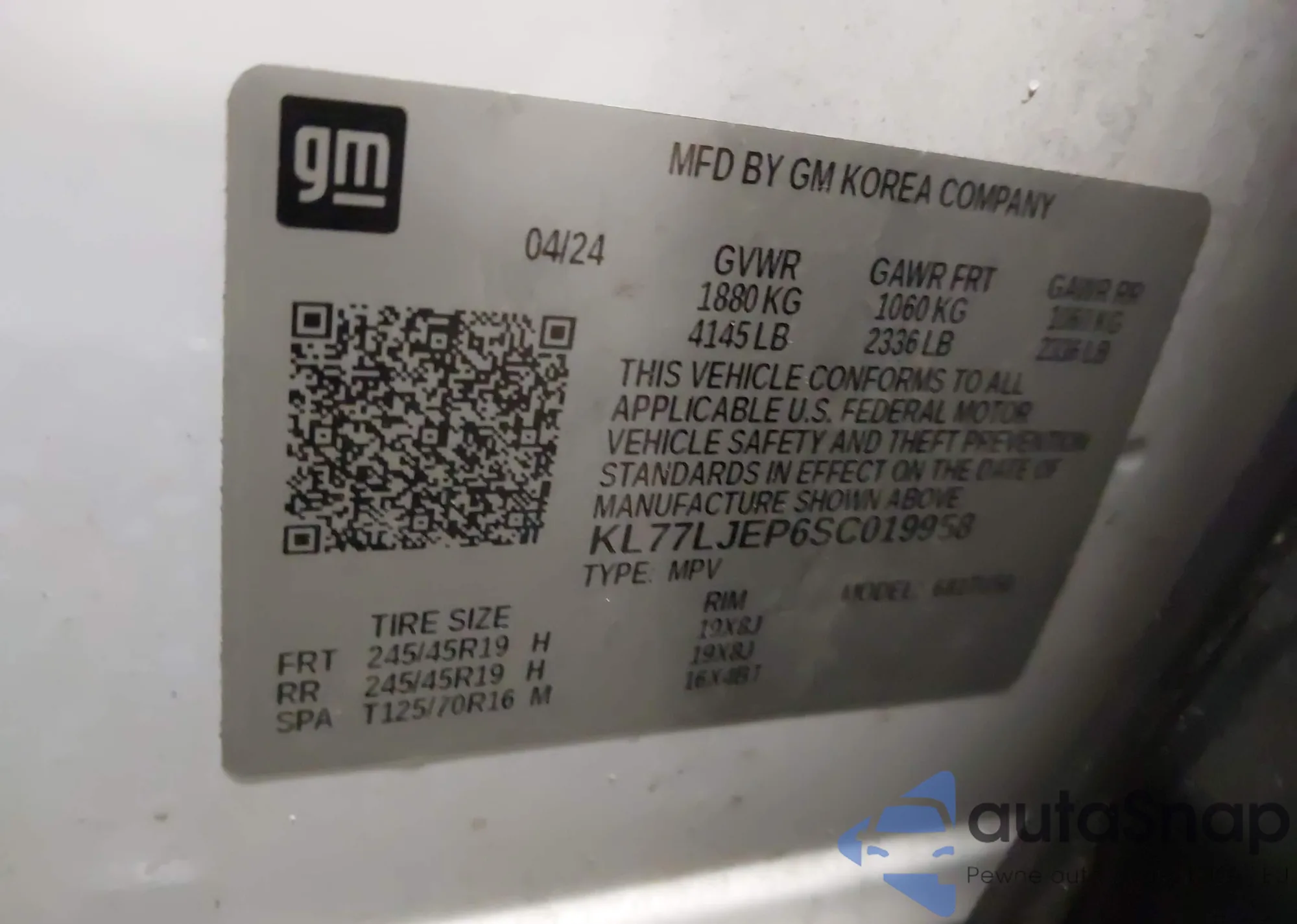 LOT: 43852682 VIN: KL77LJEP6SC019958