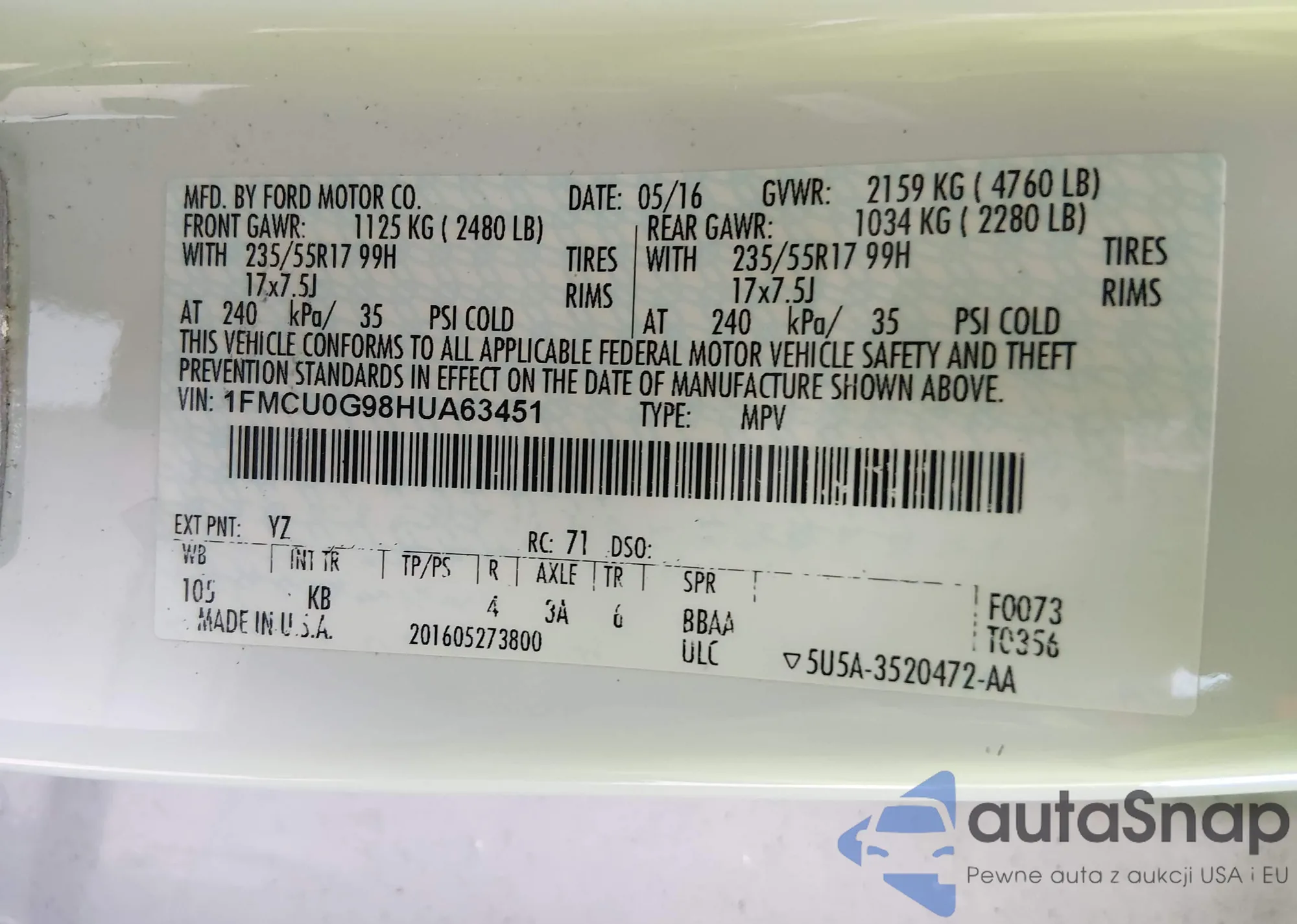 • VIN 1FMCU0G98HUA63451