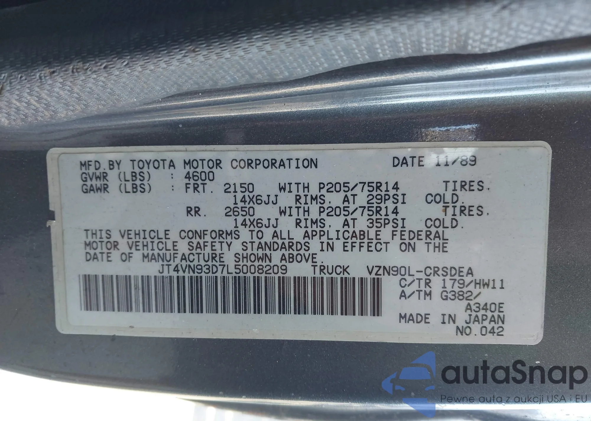 Samochód Toyota Pickup 1990 (VIN JT4VN93D7L5008209) ma dokumenty uniemożliwiające rejestrację. Mogą pojawić się trudności przy eksporcie i rejestracji. Skontaktuj się z ekspertami AutaSnap w celu znalezienia alternatywy.