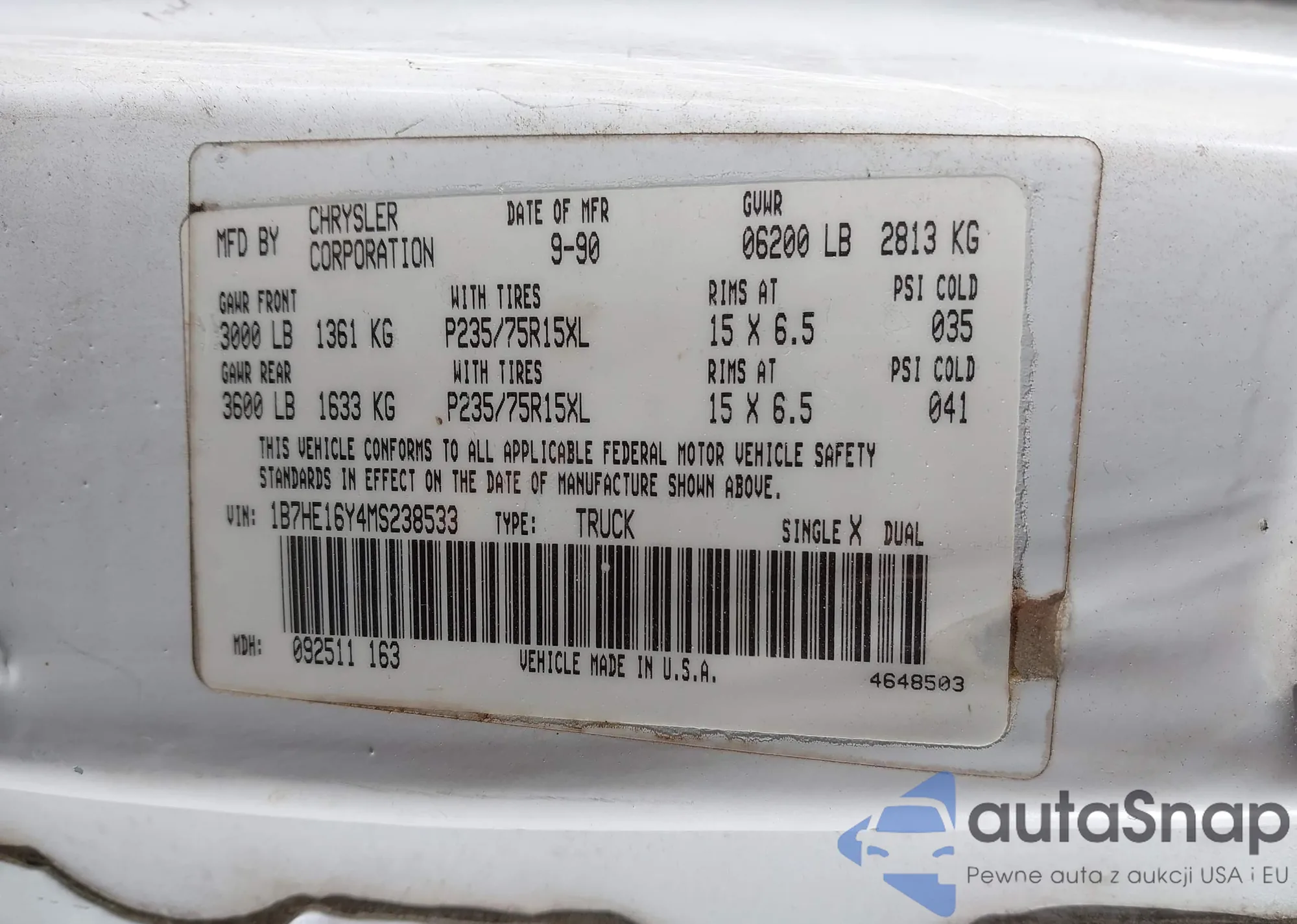 Samochód Dodge D/W Series 1991 (VIN 1B7HE16Y4MS238533) był już licytowany 1 razy i/lub sprzedaje go niezweryfikowany sprzedawca. Zalecamy raport Carfax i potwierdzenie możliwości rejestracji pojazdu przed zakupem.