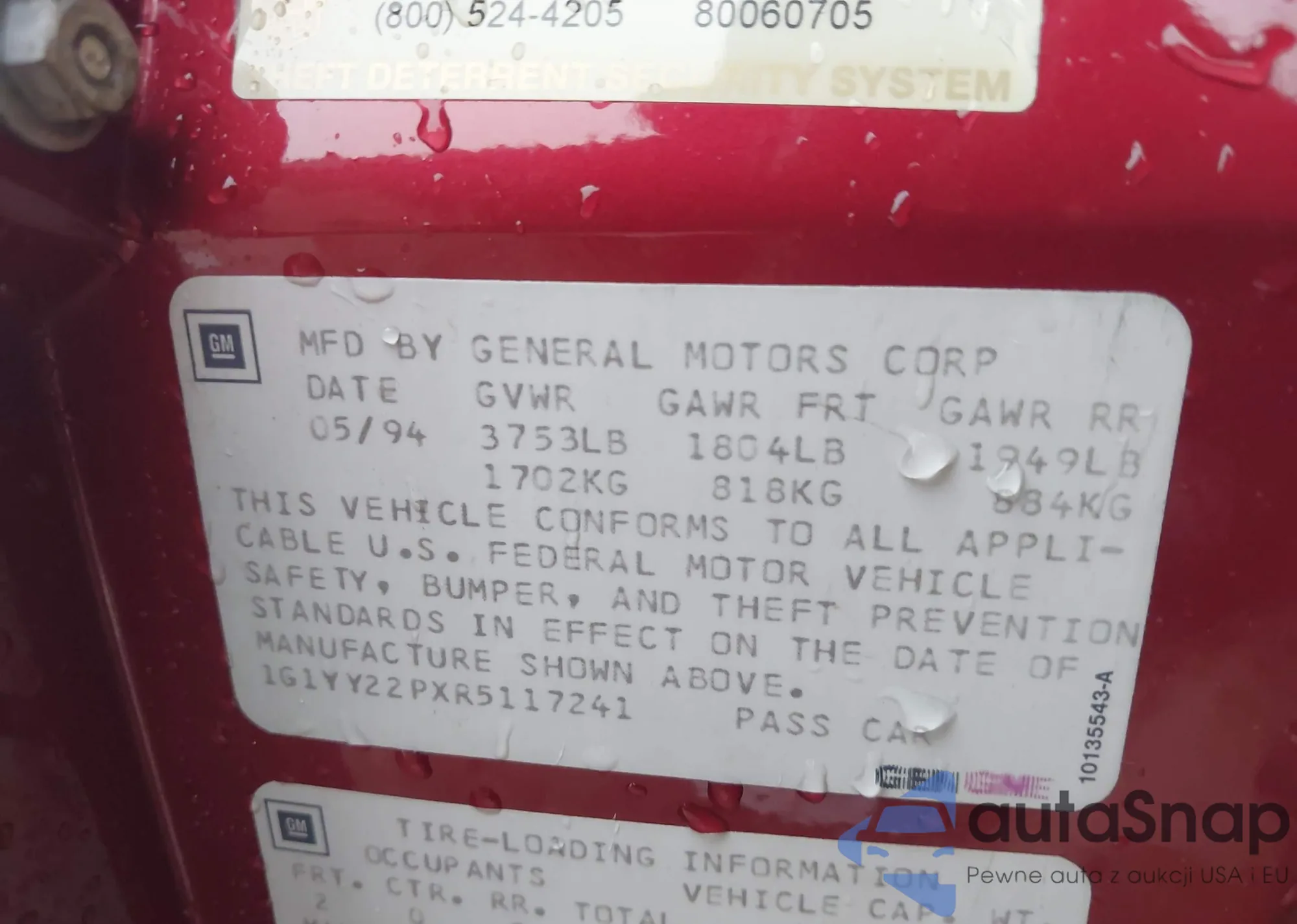 Samochód Chevrolet Corvette 1994 (VIN 1G1YY22PXR5117241) nie był wcześniej licytowany. Dokumenty są czyste, przebieg odpowiada lub jest niższy niż średnia rynku. Sprzedaje go firma ubezpieczeniowa – polecamy zakup. Dostawa do portu zajmie ok. 6–8 tygodni.