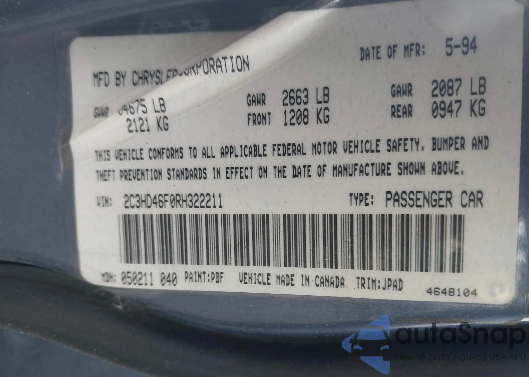 VIN: 2C3HD46F0RH322211