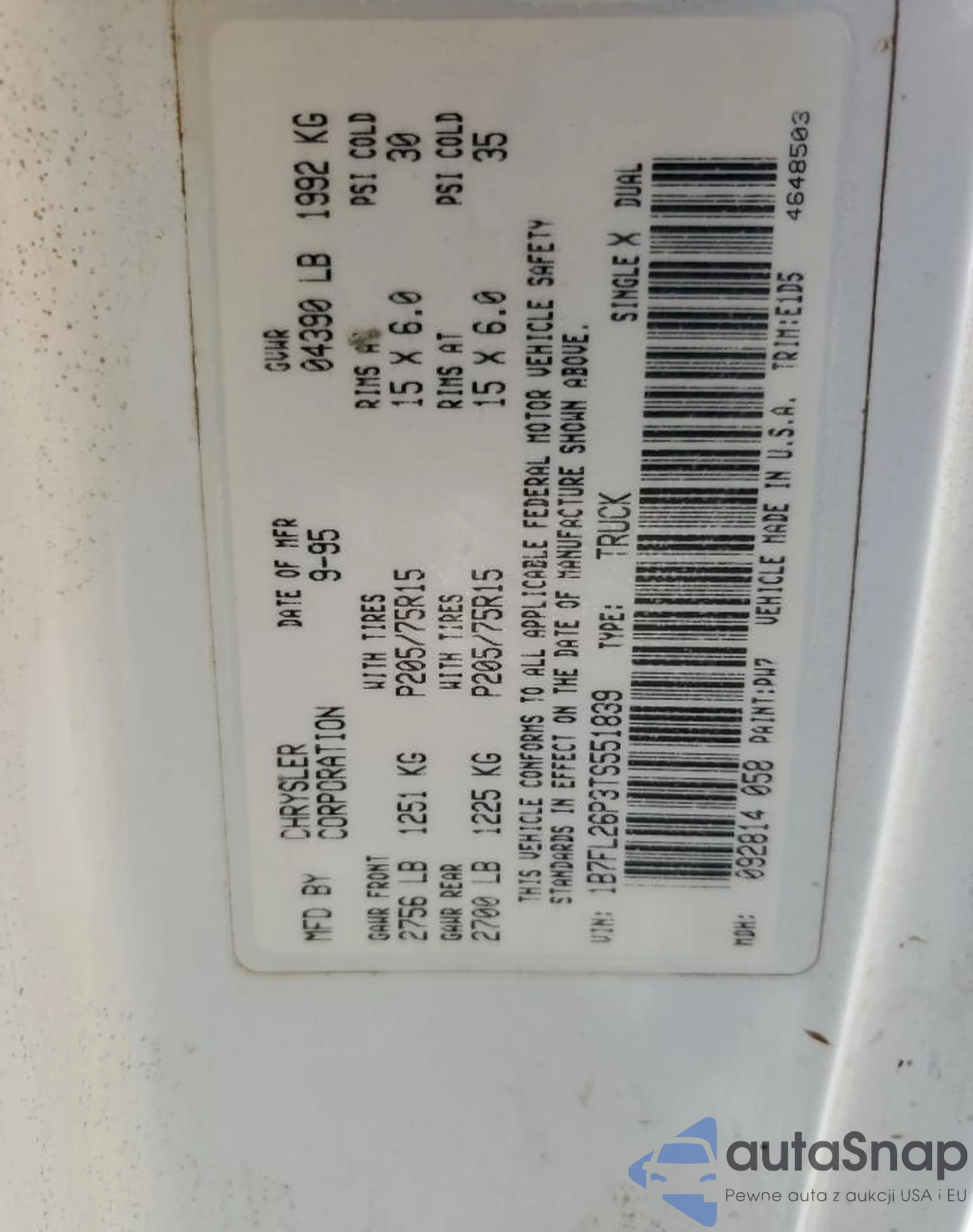 Samochód Dodge Dakota 1995 (VIN 1B7FL26P3TS551839) ma dokumenty uniemożliwiające rejestrację. Mogą pojawić się trudności przy eksporcie i rejestracji. Skontaktuj się z ekspertami AutaSnap w celu znalezienia alternatywy.