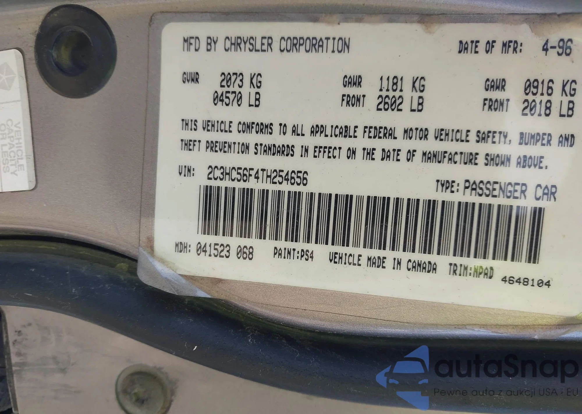 Samochód Chrysler LHS 1996 (VIN 2C3HC56F4TH254656) nie był wcześniej licytowany. Dokumenty są czyste, przebieg odpowiada lub jest niższy niż średnia rynku. Sprzedaje go firma ubezpieczeniowa – polecamy zakup. Dostawa do portu zajmie ok. 6–8 tygodni.