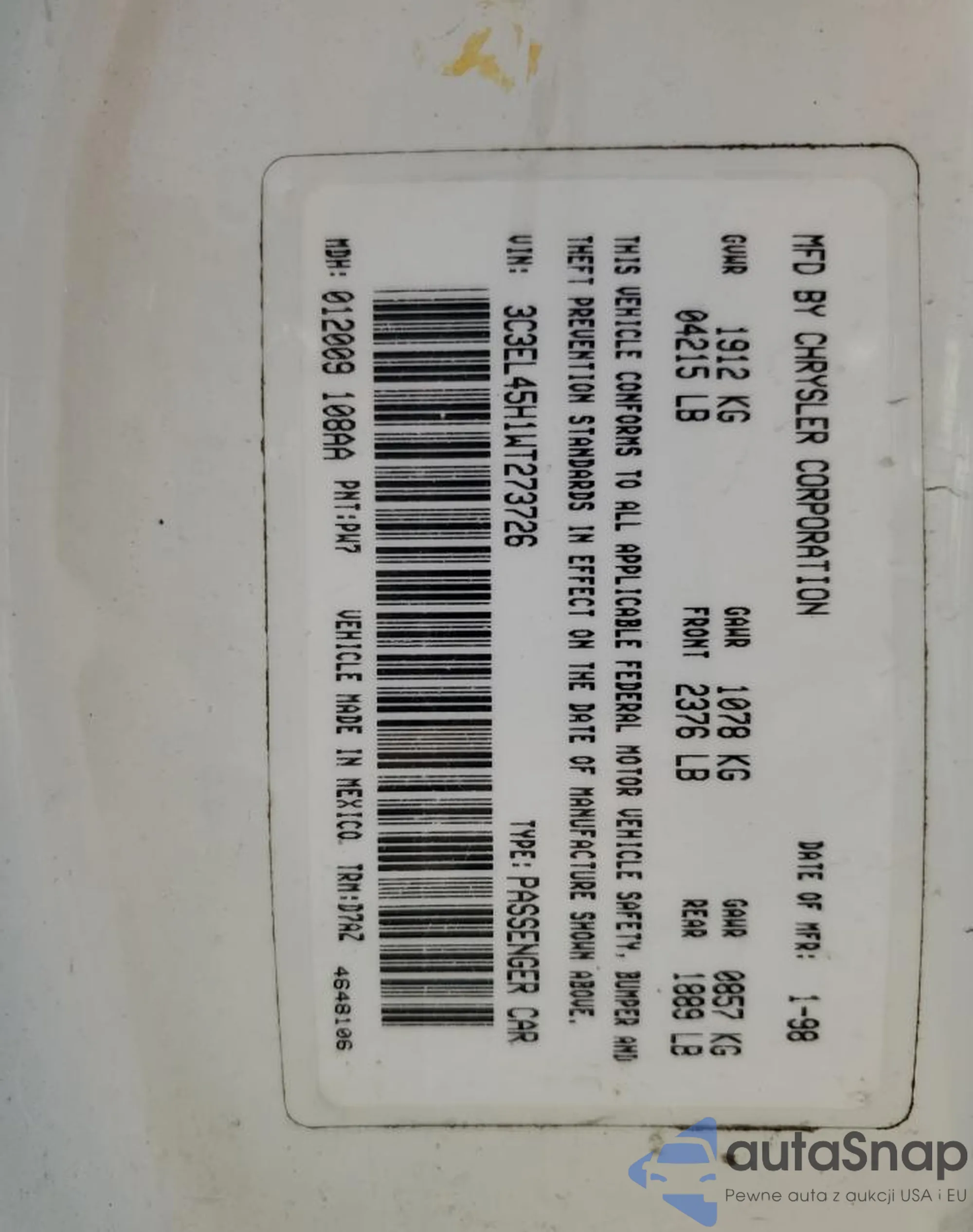 Samochód Chrysler Sebring 1998 (VIN 3C3EL45H1WT273726) nie był wcześniej licytowany. Dokumenty są czyste, przebieg odpowiada lub jest niższy niż średnia rynku. Sprzedaje go firma ubezpieczeniowa – polecamy zakup. Dostawa do portu zajmie ok. 6–8 tygodni.