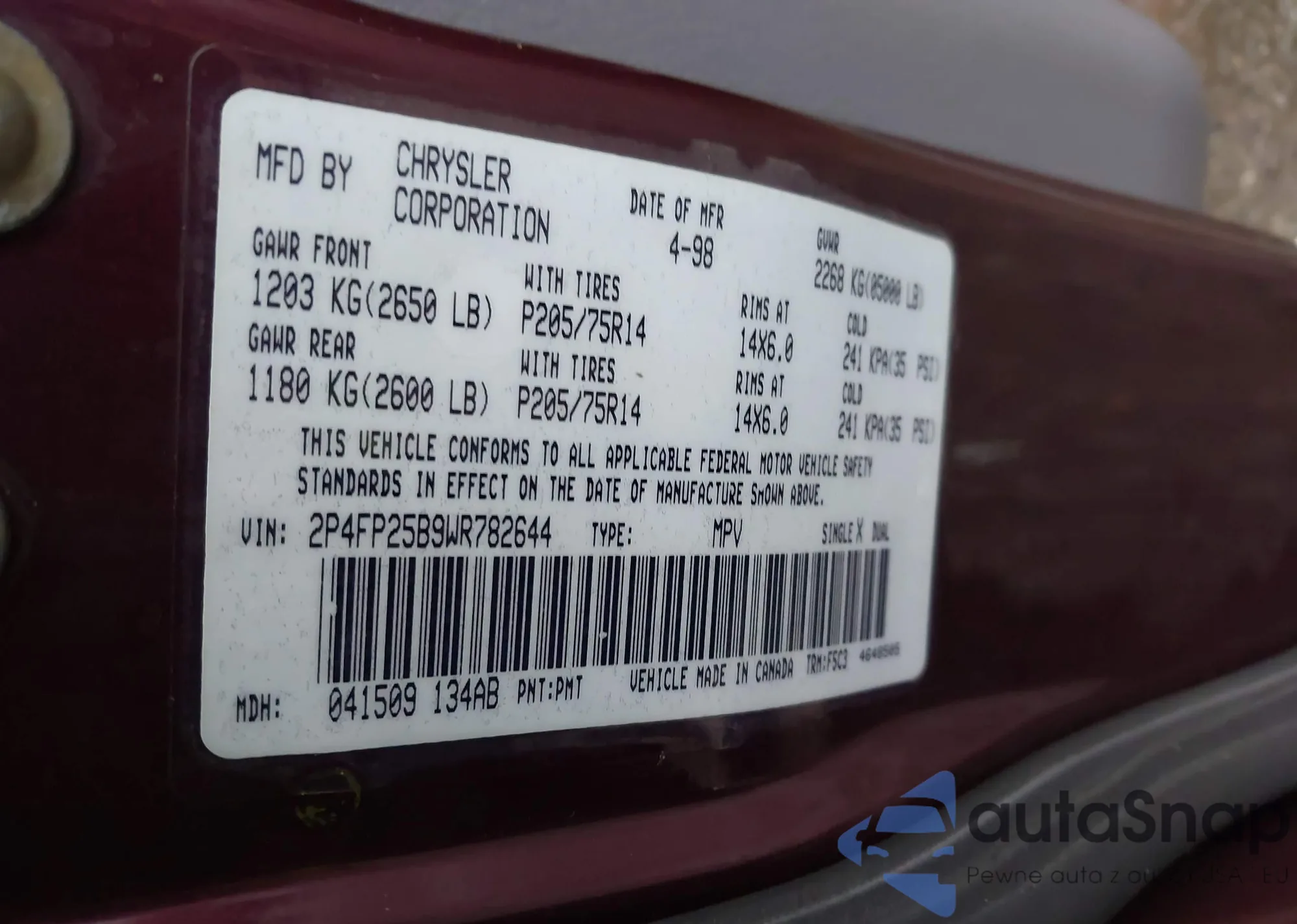 • VIN: 2P4FP25B9WR782644
