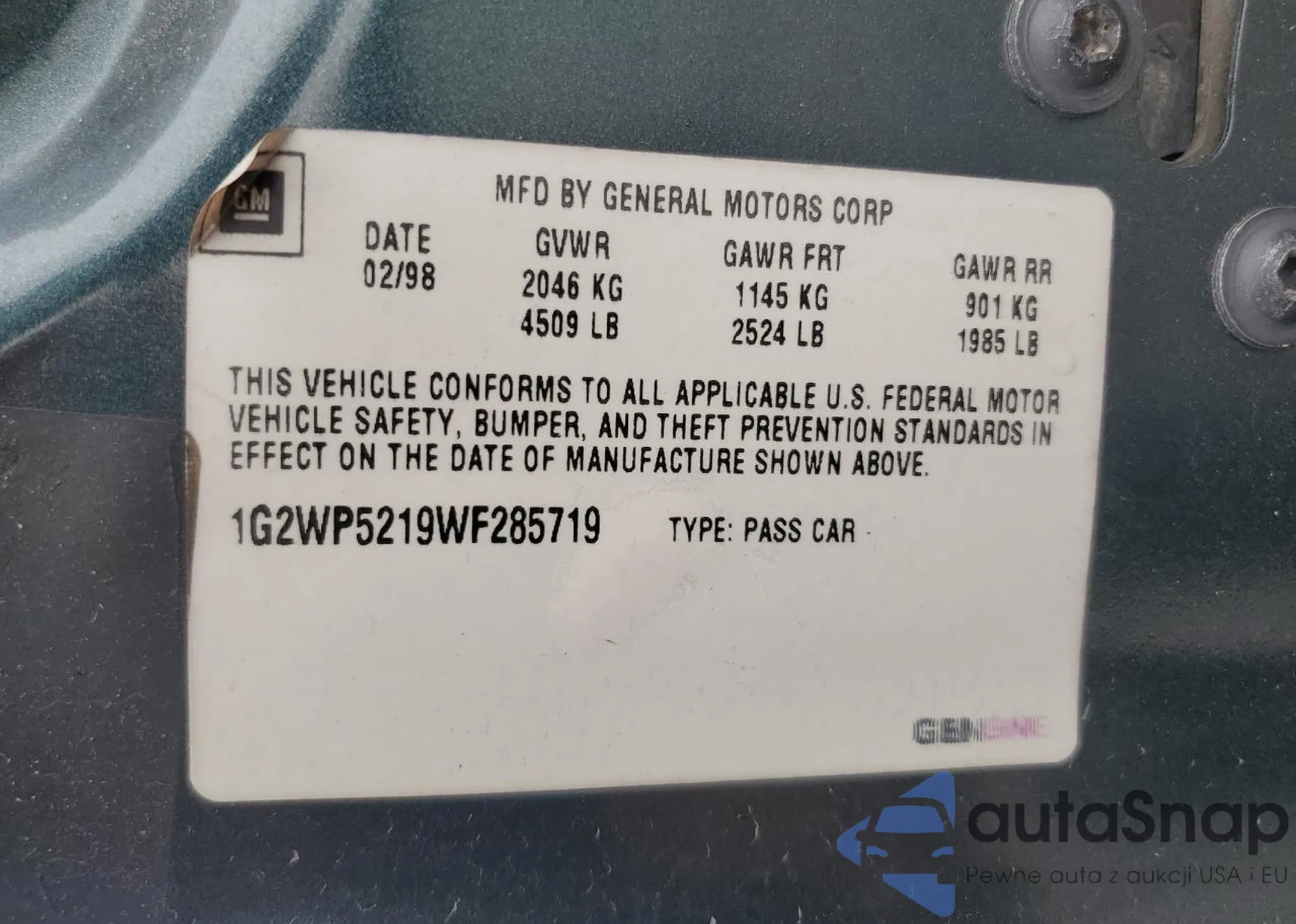 Samochód Pontiac Grand Prix 1998 (VIN 1G2WP5219WF285719) nie był wcześniej licytowany. Dokumenty są czyste, przebieg odpowiada lub jest niższy niż średnia rynku. Sprzedaje go firma ubezpieczeniowa – polecamy zakup. Dostawa do portu zajmie ok. 6–8 tygodni.