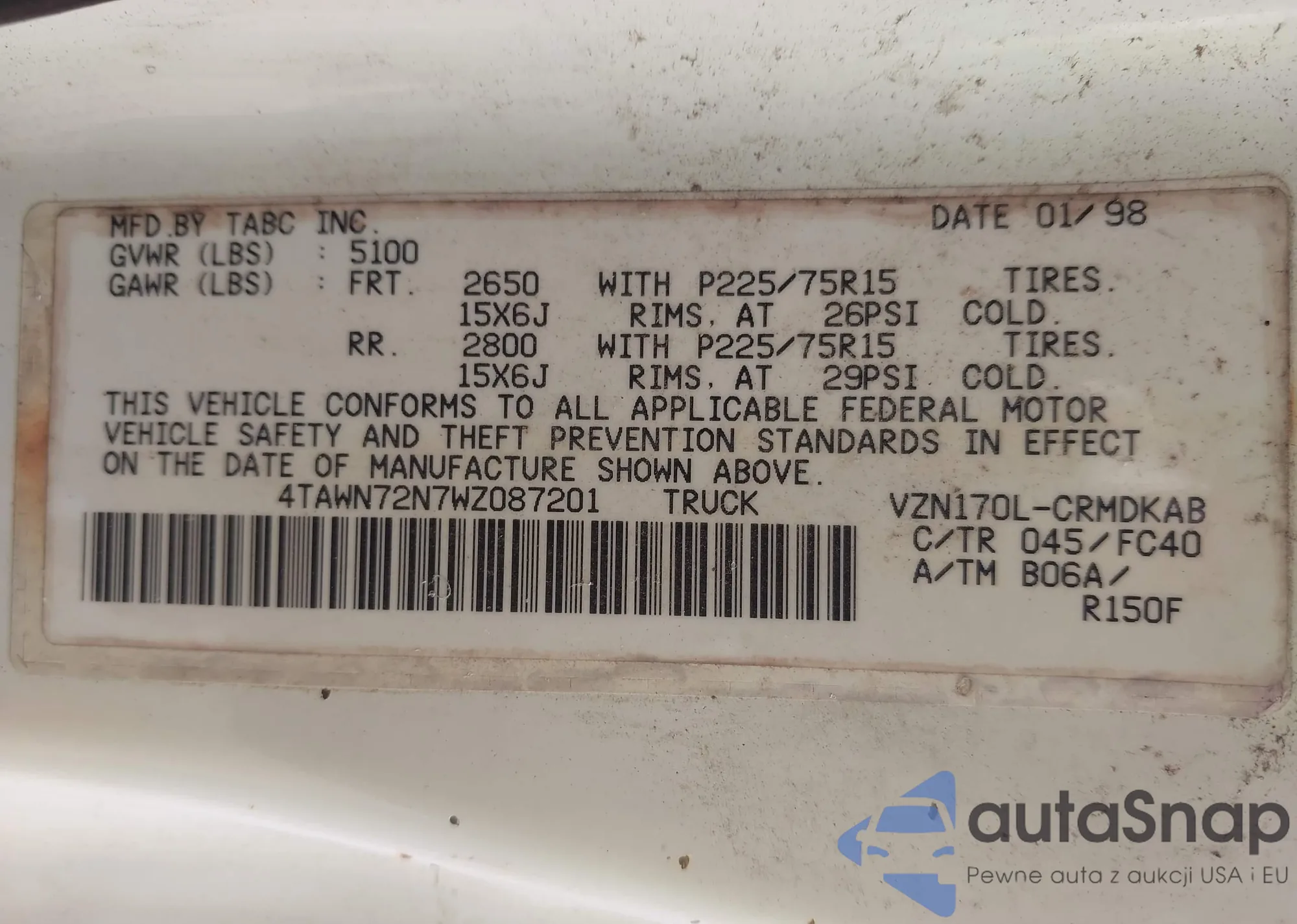 VIN: 4TAWN72N7WZ087201