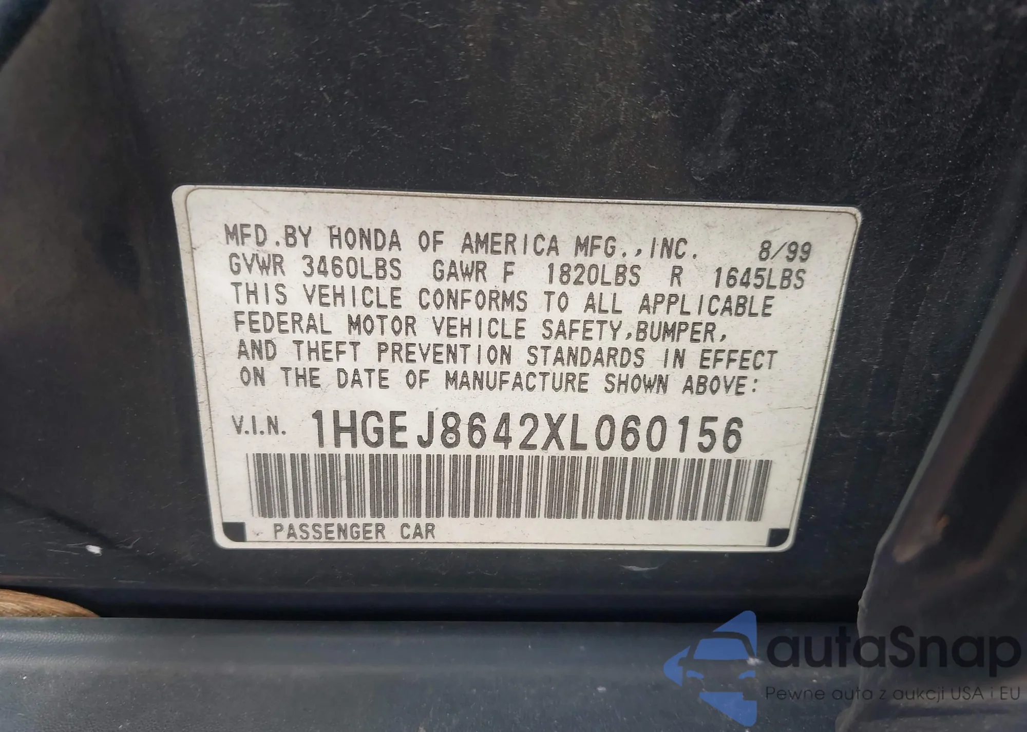 Samochód Honda Civic 1999 (VIN 1HGEJ8642XL060156) ma dokumenty uniemożliwiające rejestrację. Mogą pojawić się trudności przy eksporcie i rejestracji. Skontaktuj się z ekspertami AutaSnap w celu znalezienia alternatywy.
