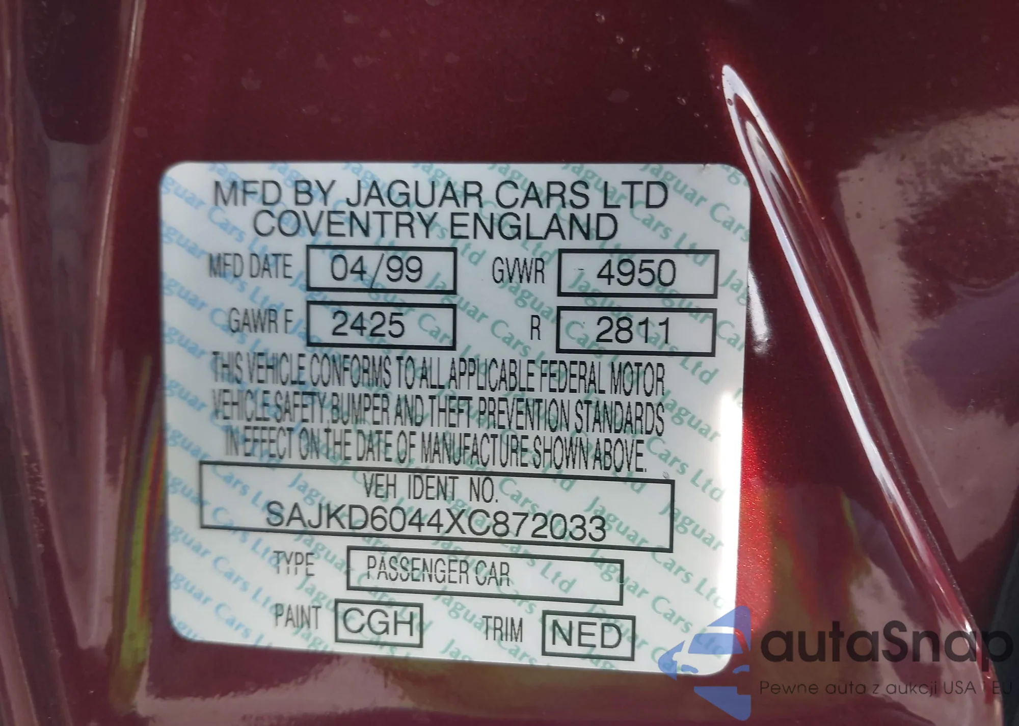 Samochód Jaguar XJ 1999 (VIN SAJKD6044XC872033) ma dokumenty uniemożliwiające rejestrację. Mogą pojawić się trudności przy eksporcie i rejestracji. Skontaktuj się z ekspertami AutaSnap w celu znalezienia alternatywy.