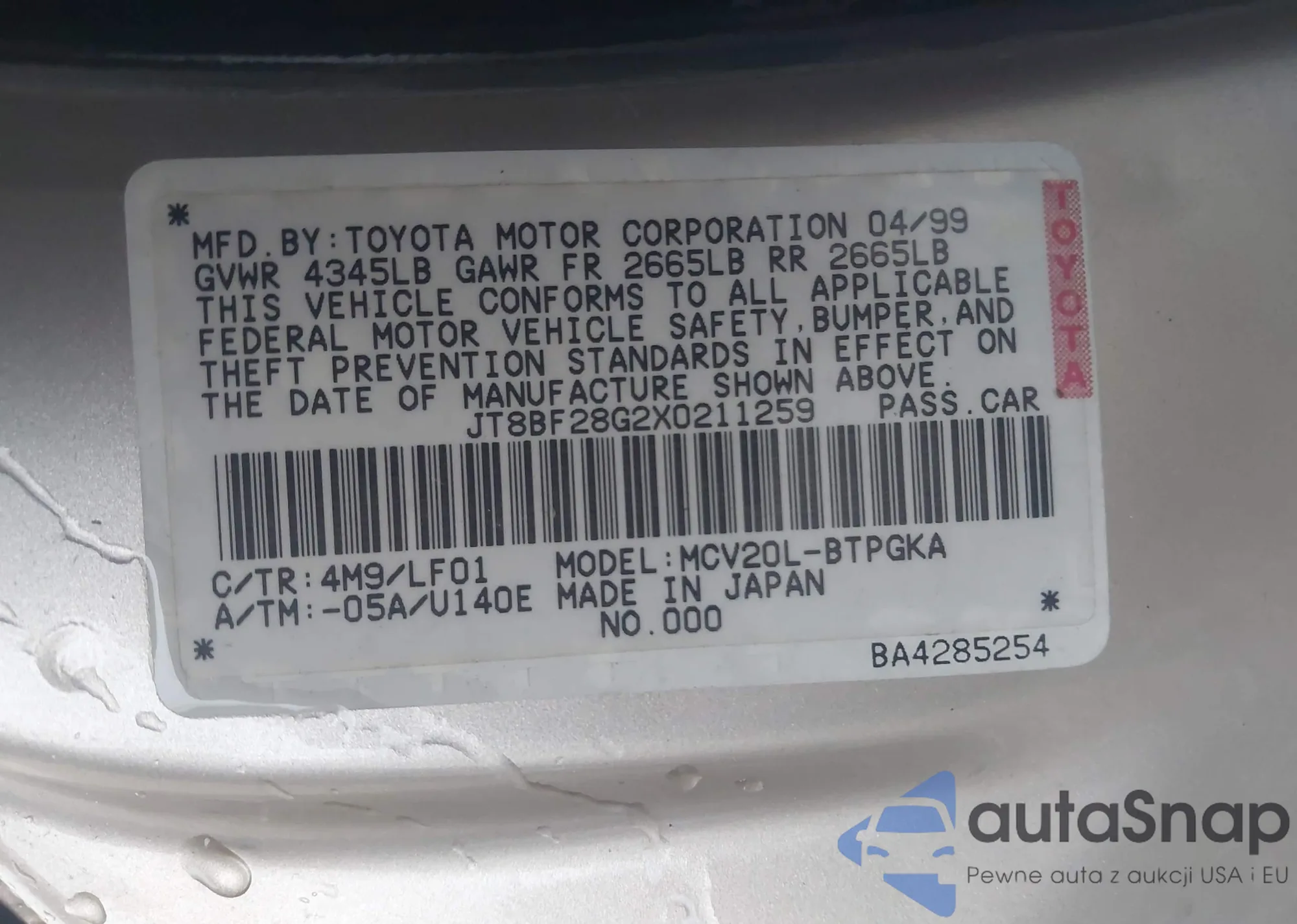 VIN: JT8BF28G2X0211259
