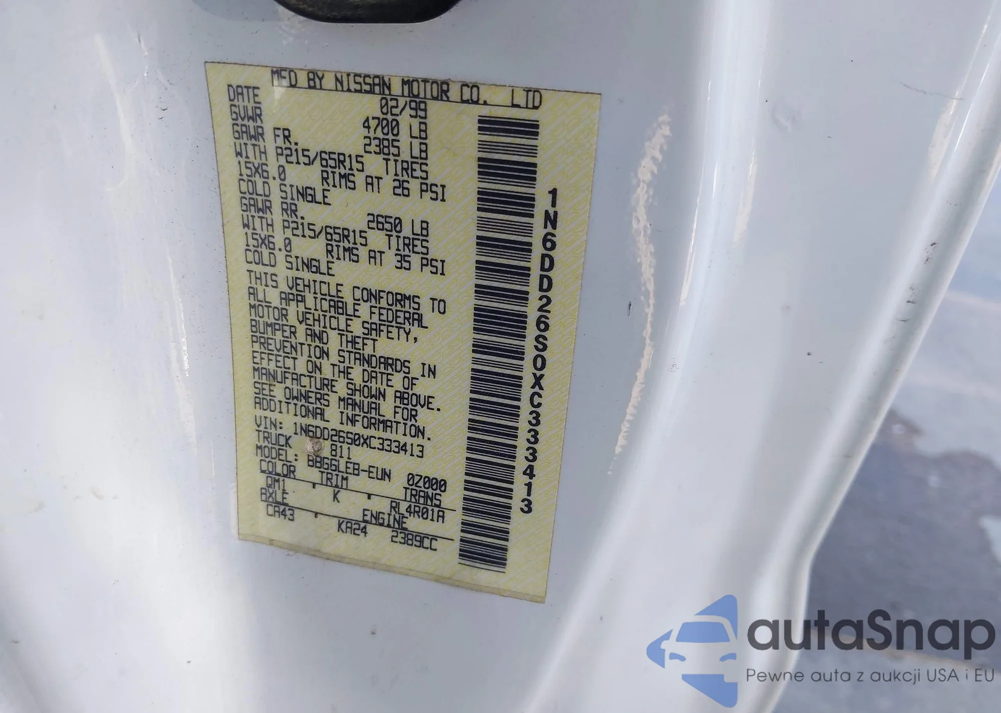 Samochód Nissan Navara (Frontier) 1999 (VIN 1N6DD26S0XC333413) ma dokumenty uniemożliwiające rejestrację. Mogą pojawić się trudności przy eksporcie i rejestracji. Skontaktuj się z ekspertami AutaSnap w celu znalezienia alternatywy.
