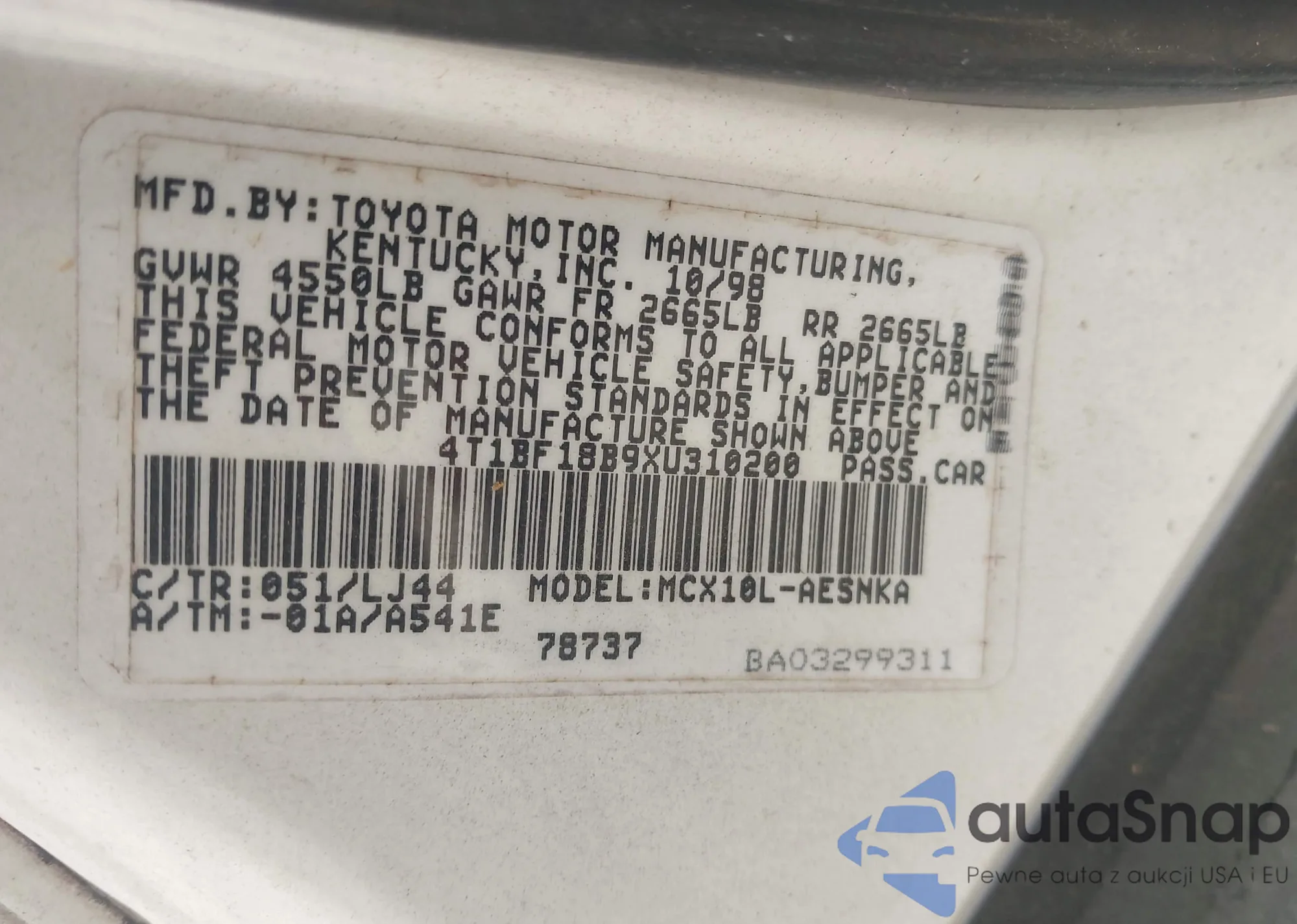VIN: 4T1BF18B9XU310200
