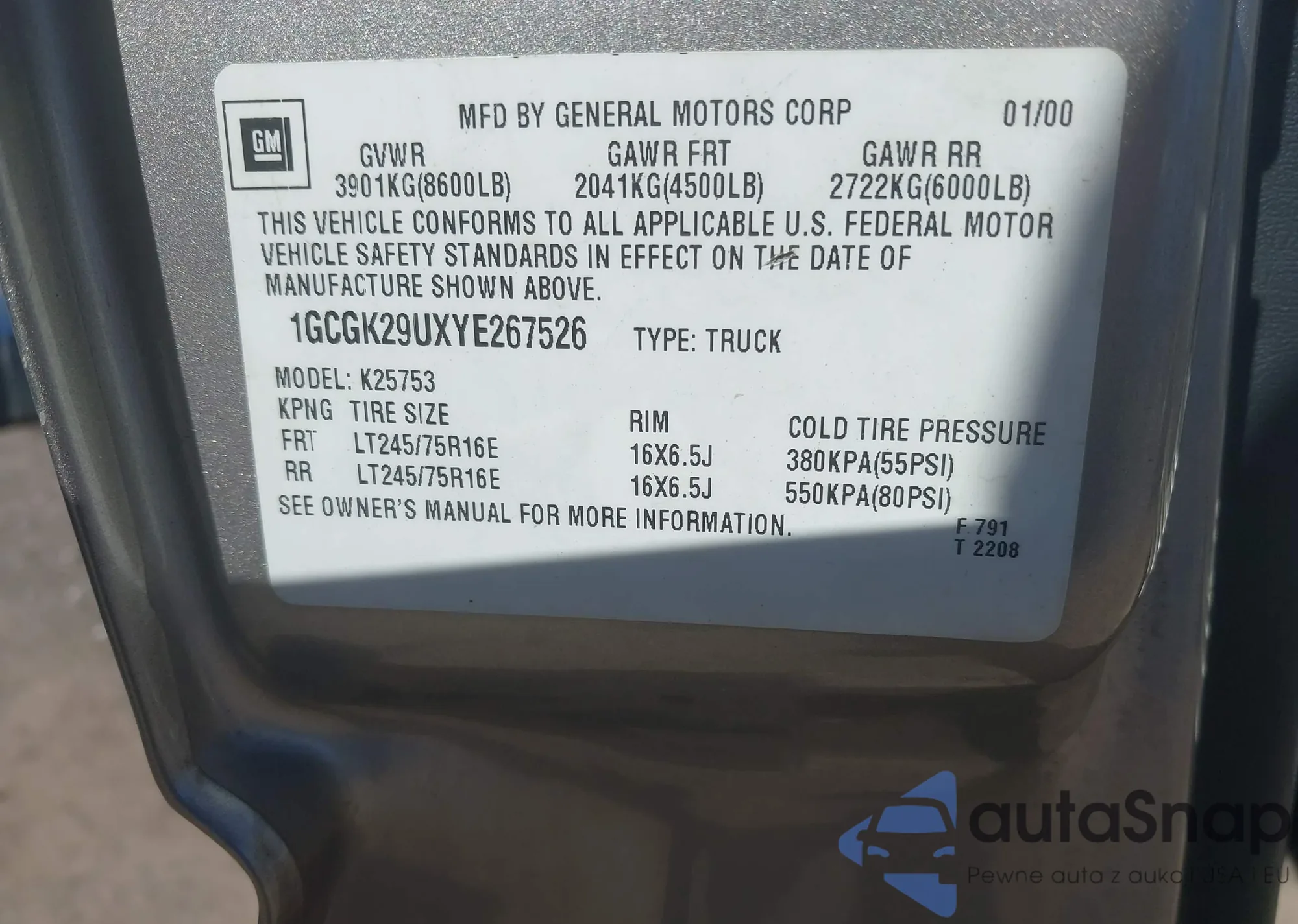 Samochód Chevrolet Silverado 2000 (VIN 1GCGK29UXYE267526) nie był wcześniej licytowany. Dokumenty są czyste, przebieg odpowiada lub jest niższy niż średnia rynku. Sprzedaje go firma ubezpieczeniowa – polecamy zakup. Dostawa do portu zajmie ok. 6–8 tygodni.