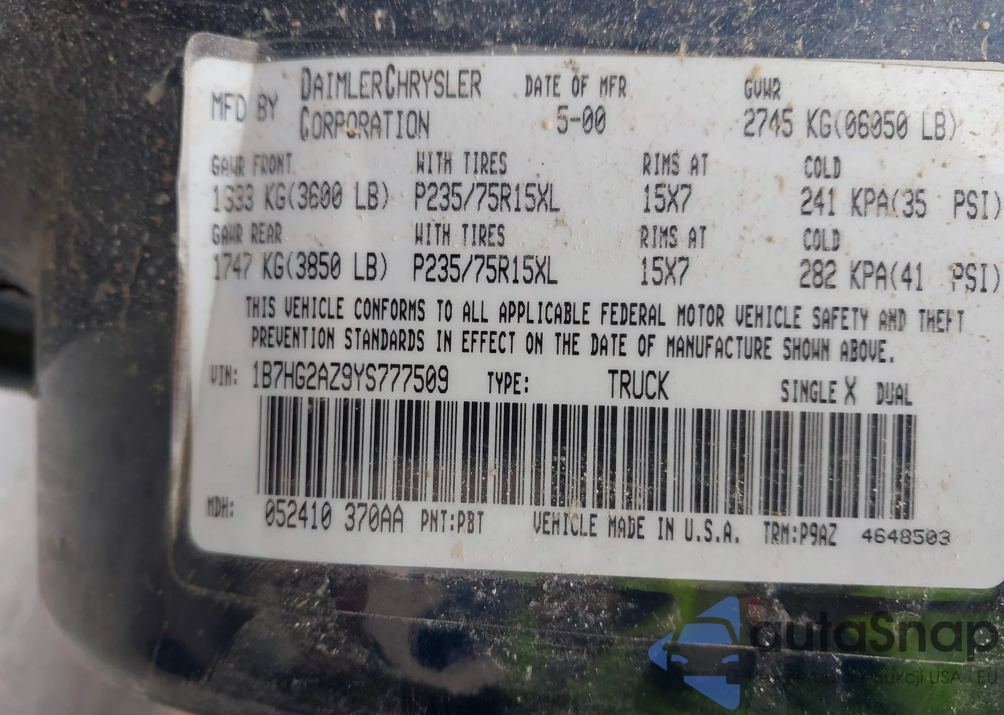 VIN: 1B7HG2AZ9YS777509