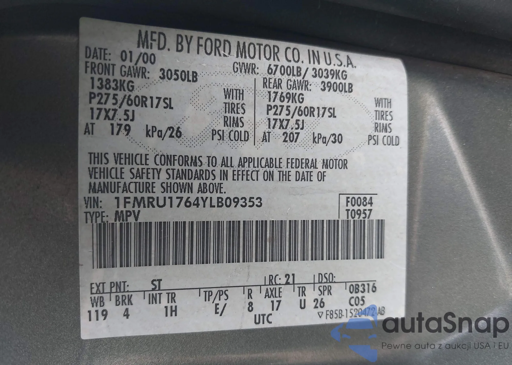 • VIN: 1FMRU1764YLB09353