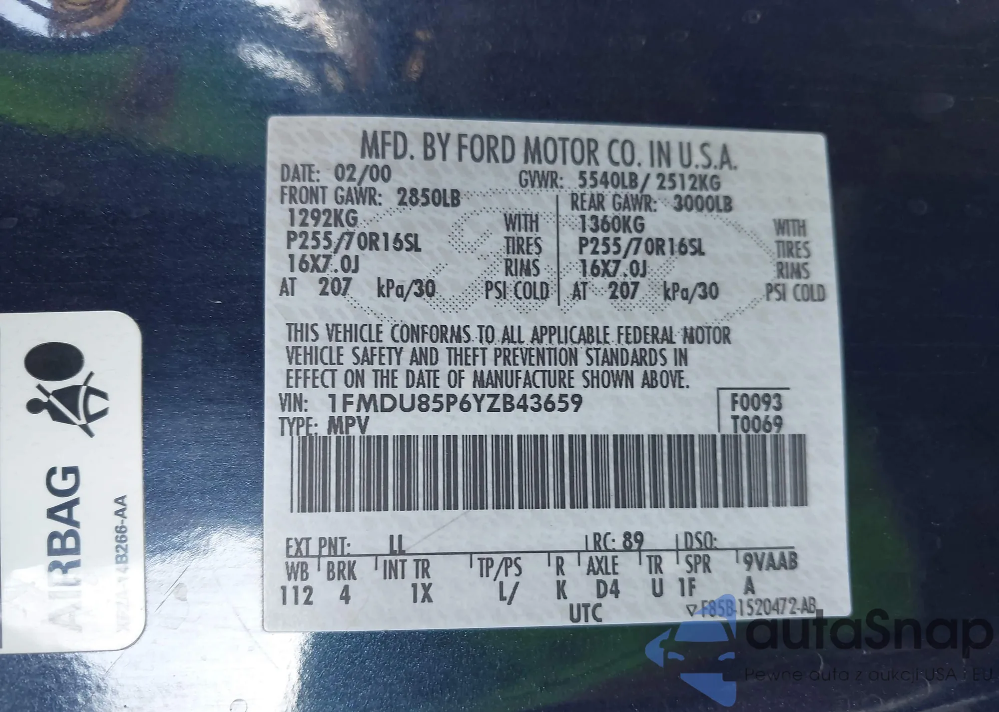 • VIN: 1FMDU85P6YZB43659