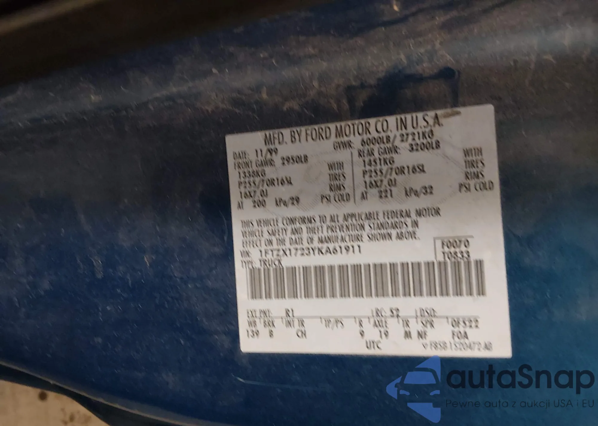 Samochód Ford F-150 2000 (VIN 1FTZX1723YKA61911) nie był wcześniej licytowany. Dokumenty są czyste, przebieg odpowiada lub jest niższy niż średnia rynku. Sprzedaje go firma ubezpieczeniowa – polecamy zakup. Dostawa do portu zajmie ok. 6–8 tygodni.