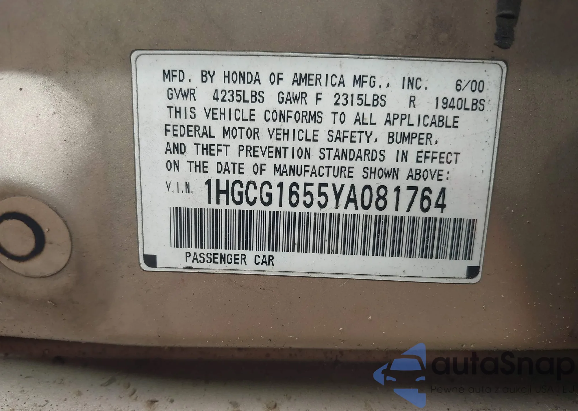 VIN: 1HGCG1655YA081764