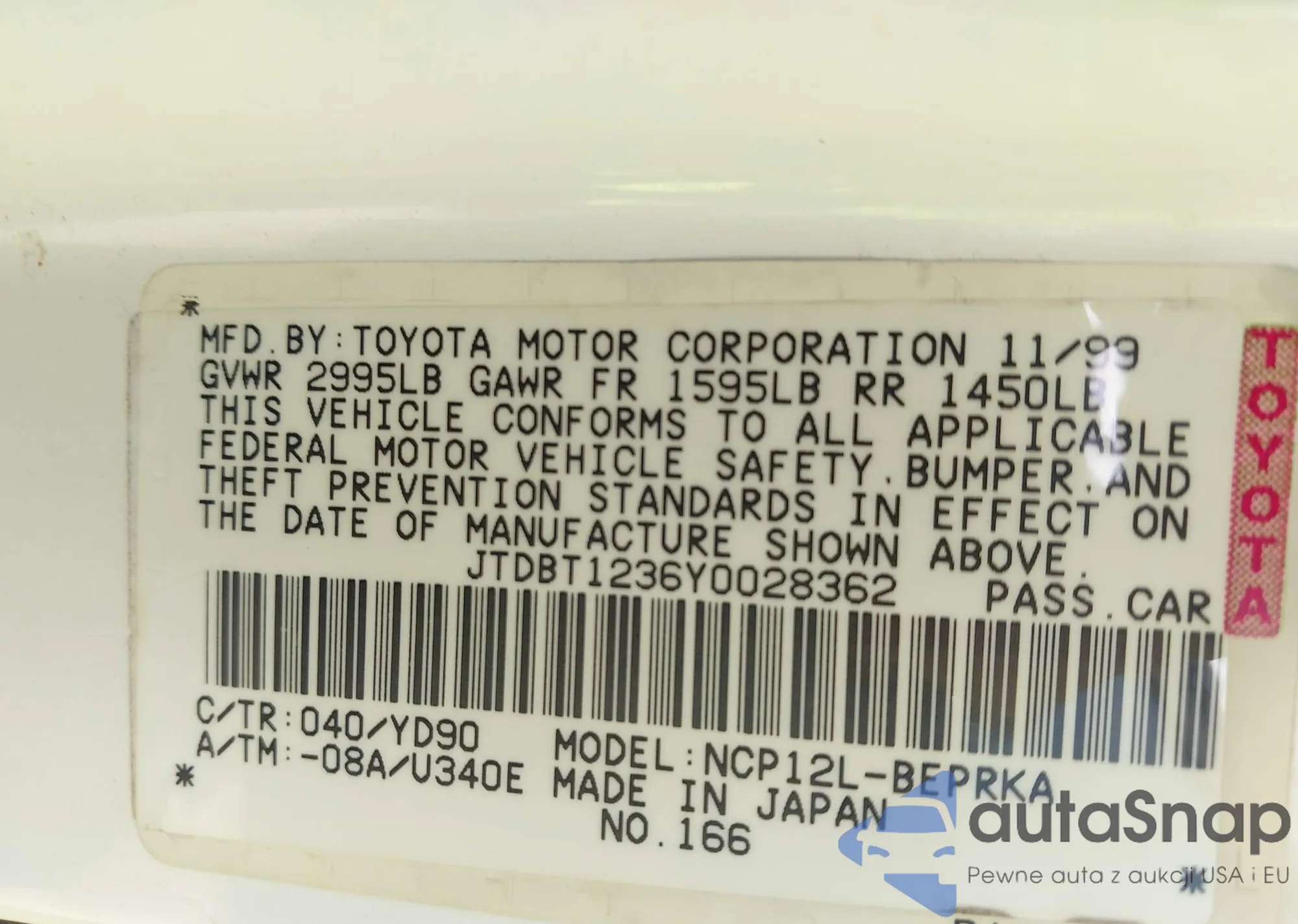 Samochód Toyota Echo 2000 (VIN JTDBT1236Y0028362) nie był wcześniej licytowany. Dokumenty są czyste, przebieg odpowiada lub jest niższy niż średnia rynku. Sprzedaje go firma ubezpieczeniowa – polecamy zakup. Dostawa do portu zajmie ok. 6–8 tygodni.
